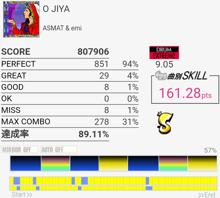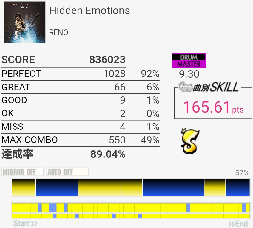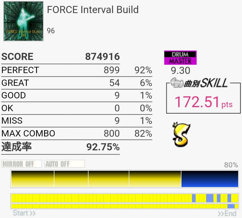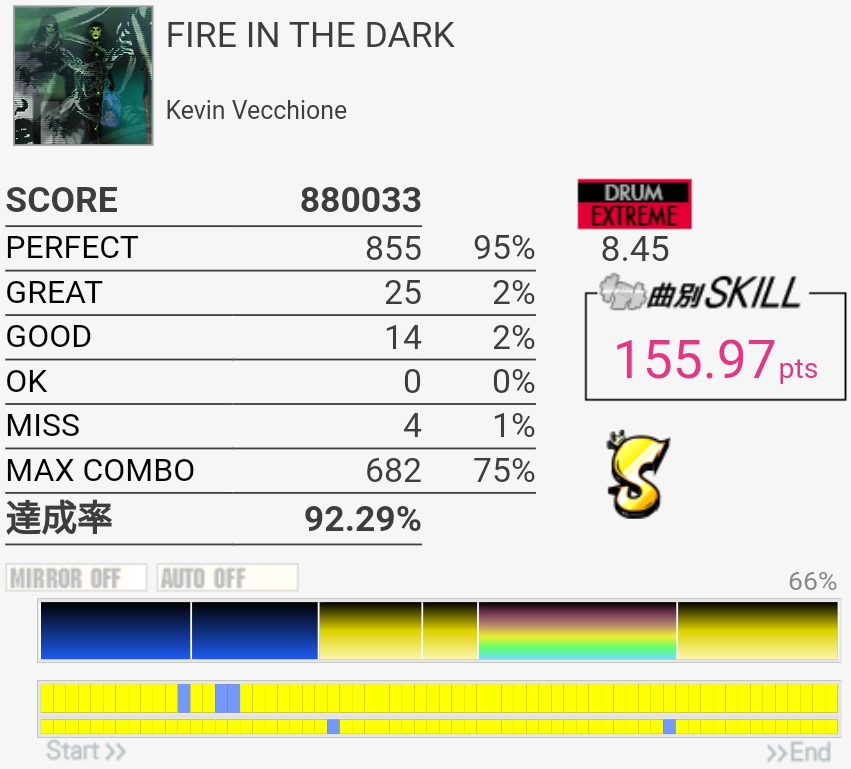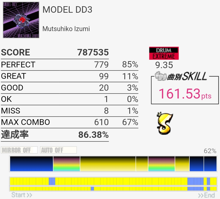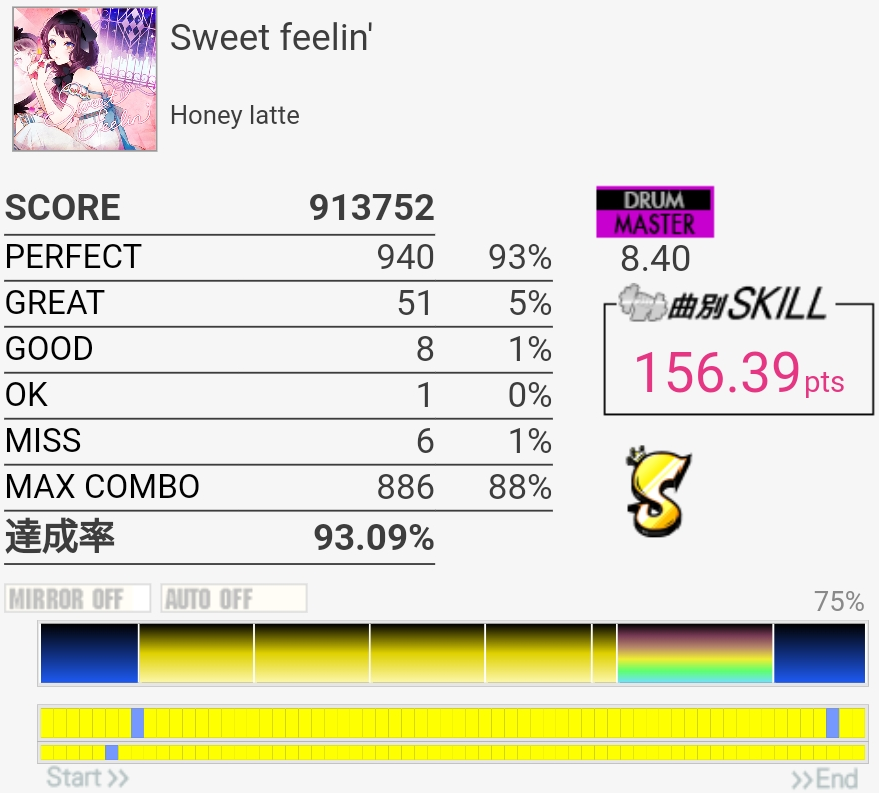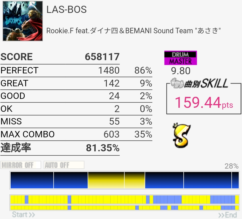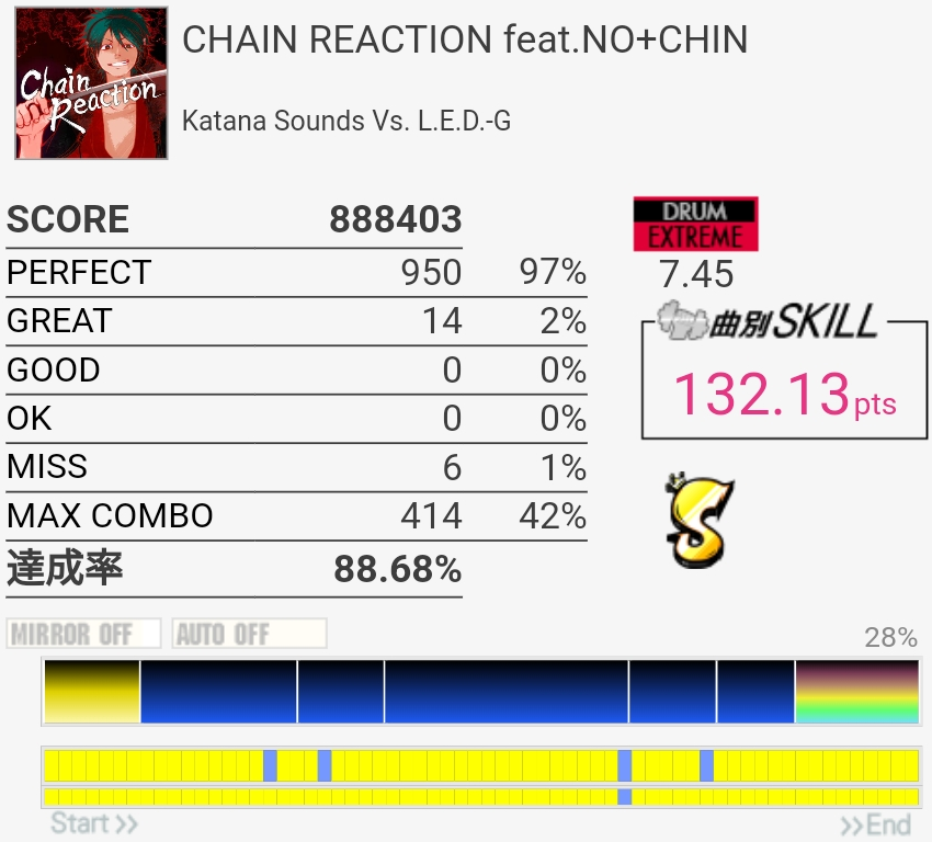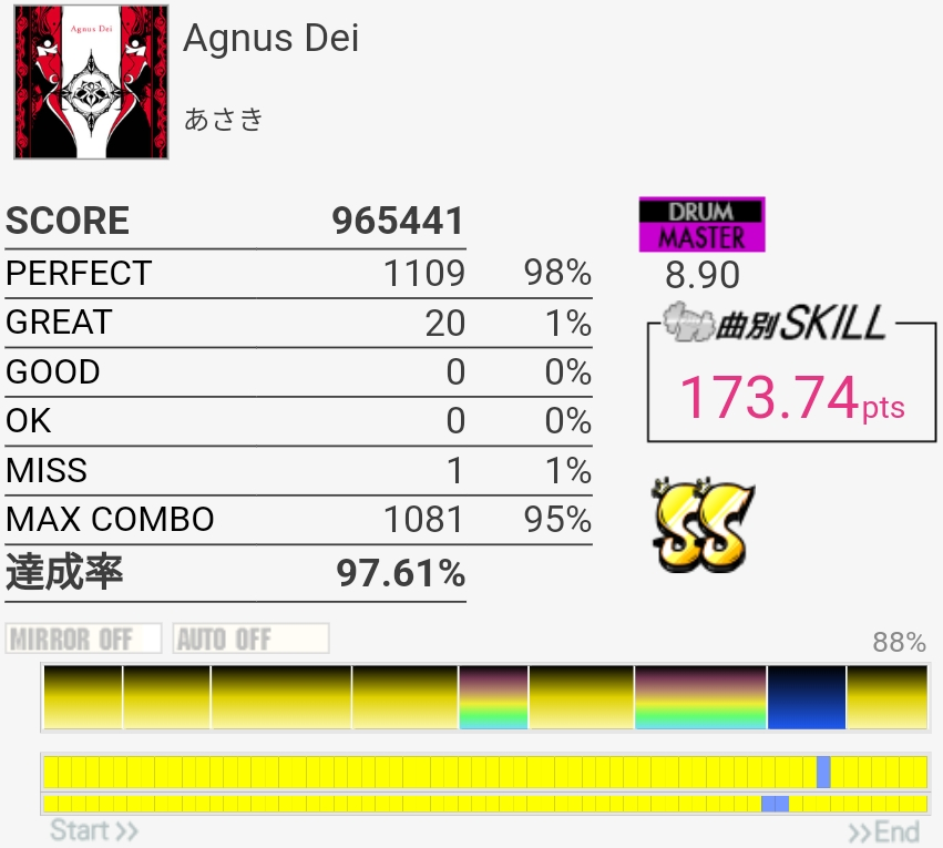 対象入り。いやパフェ率高くない?なんかLT反応しなかったのめっちゃ悔しいんだけど……Pフリーで粘着してて、イントロのFT×3→SN→HTでHTを左手で認識しちゃうのがなかなか治らなくて5分くらいイントロだけやってた。