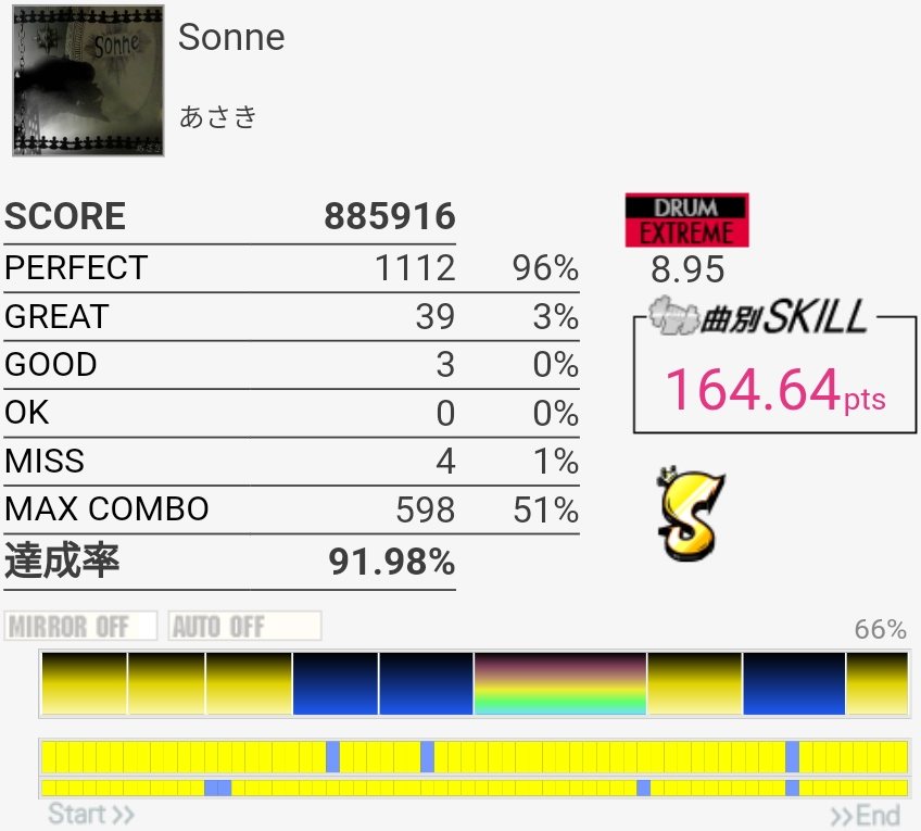 ゴリ押し部分はなんかうまくいったんだけど曲が聞こえづらくてめっちゃズレた。左手辛い。