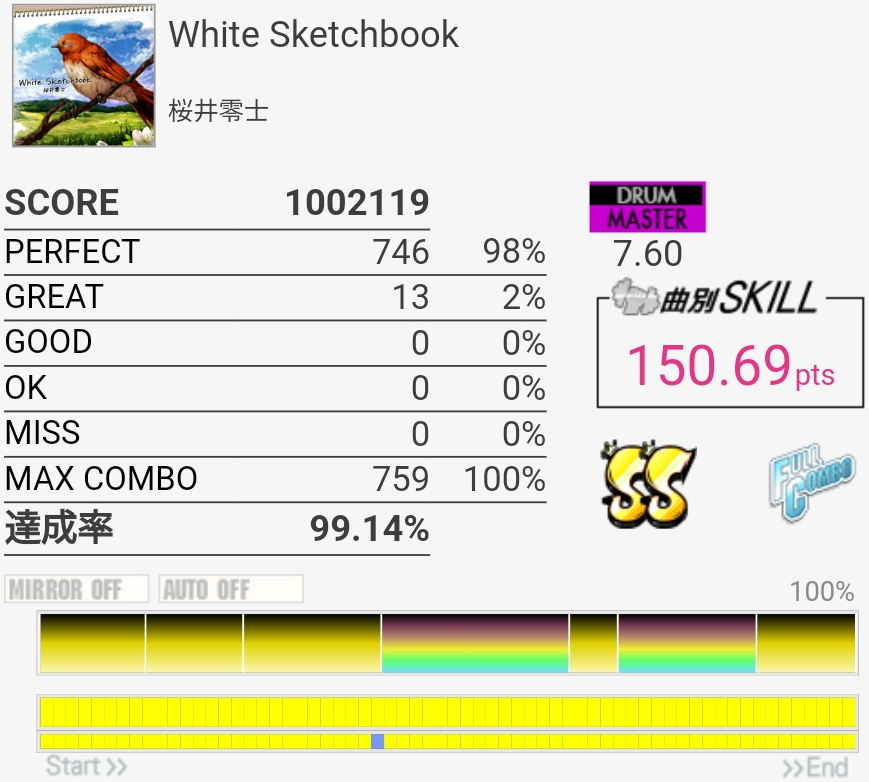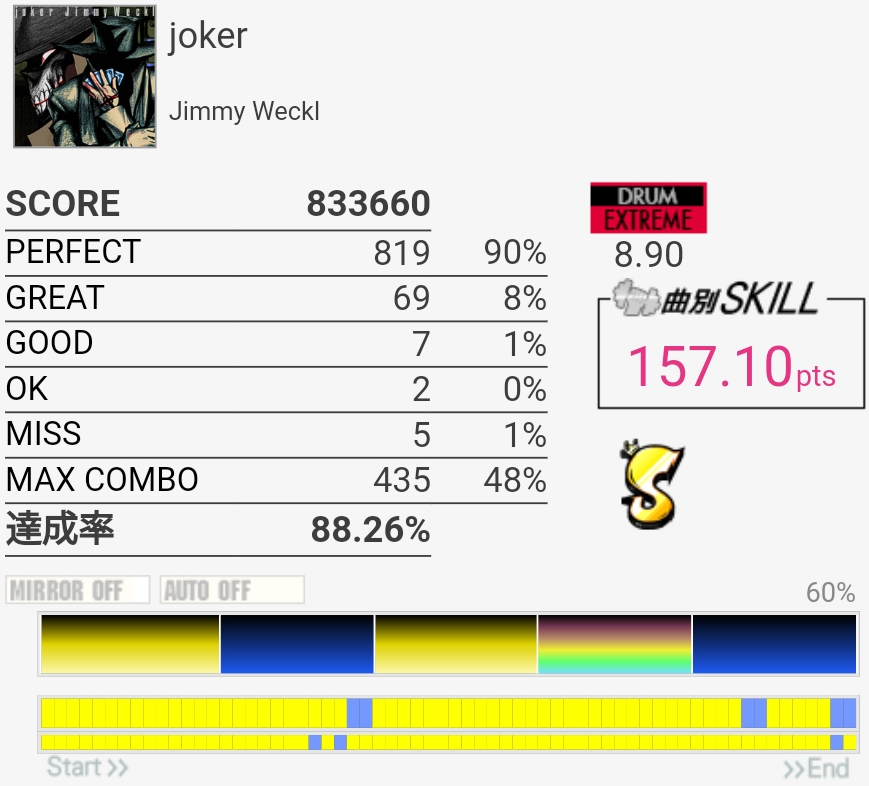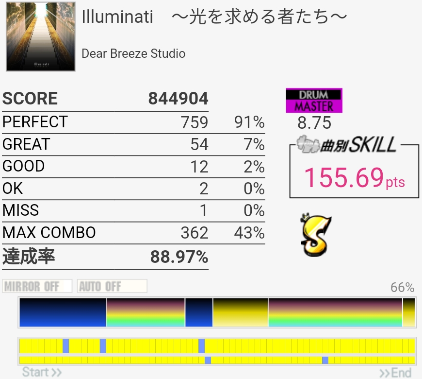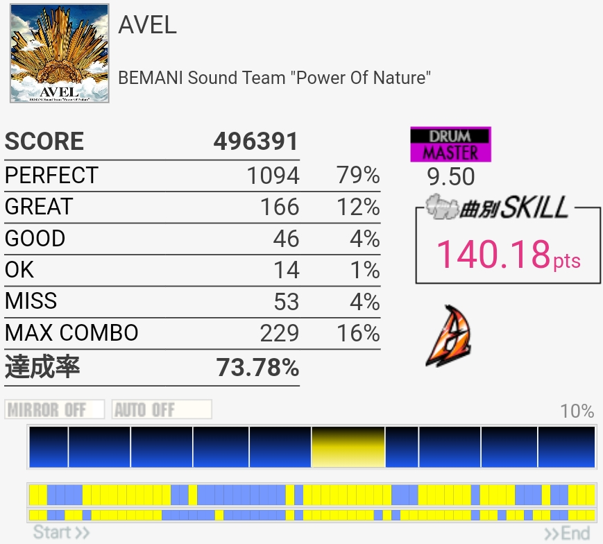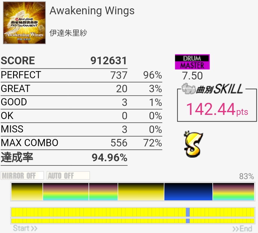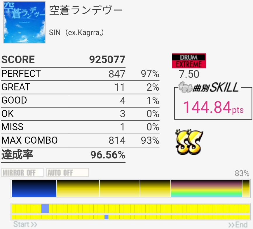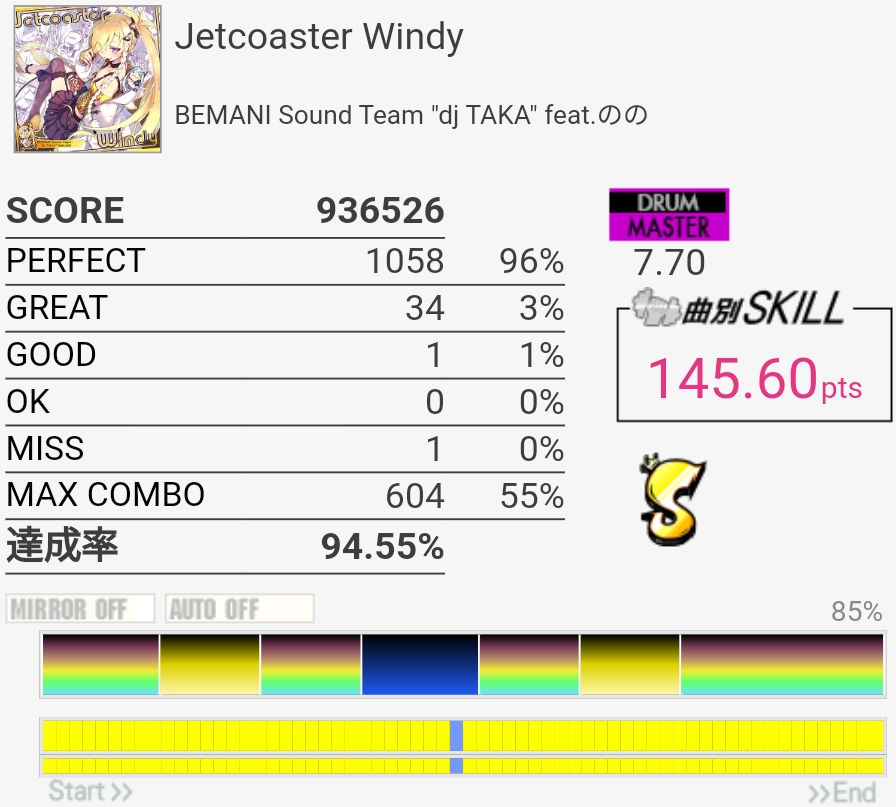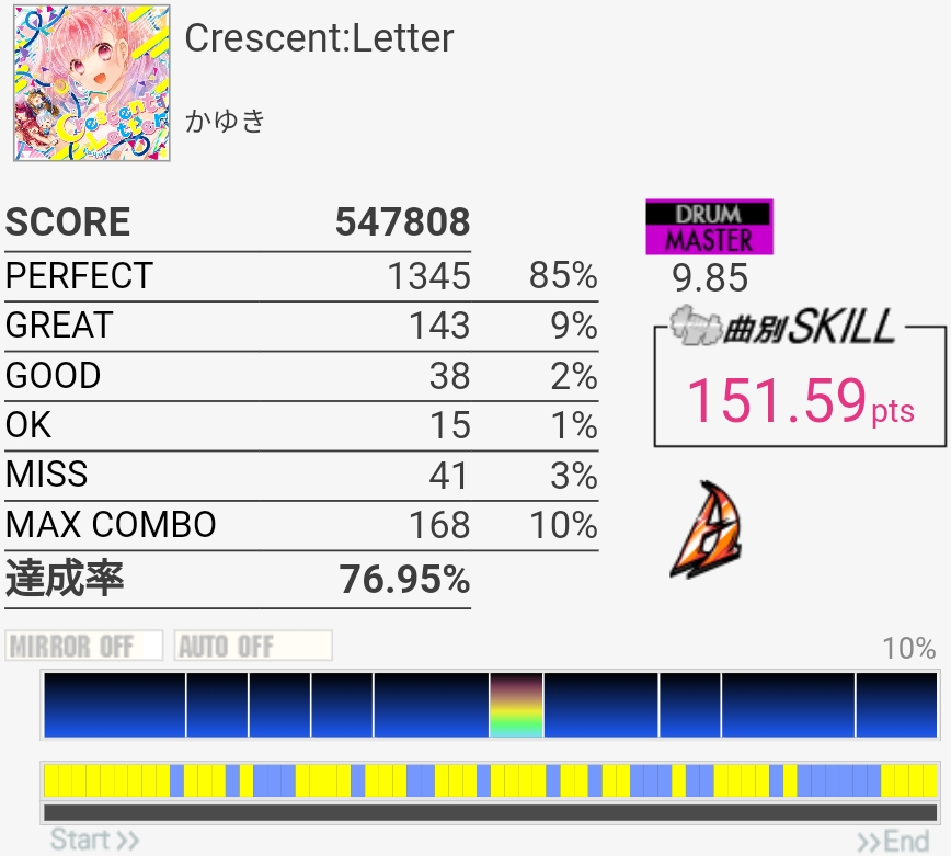 クリアできなかった(笑)いや笑えん。おそらくシングルで回せる部分が多いんだろうけど体感で天泣の倍くらい物量あるしコンチェみたいな連打が辛すぎる。そこから最後のよくわかんないタムで削られて……これ9.95でよくない?