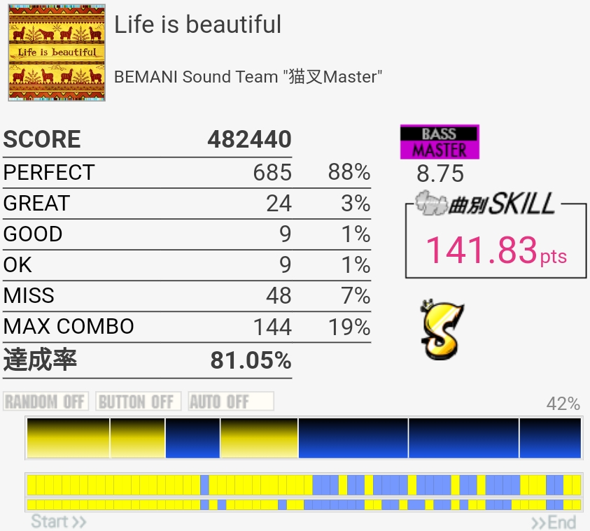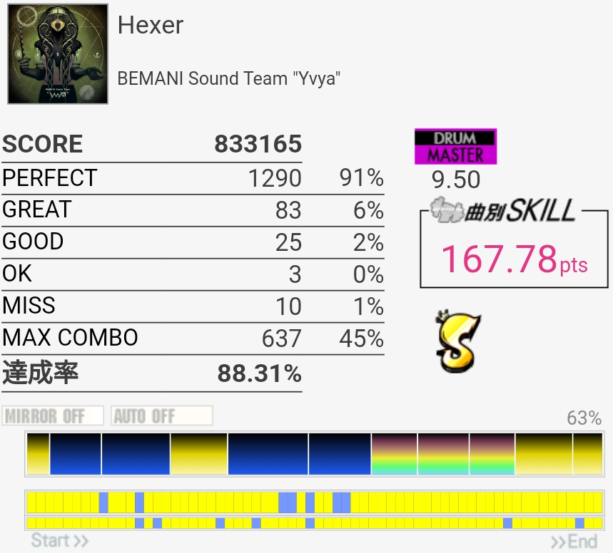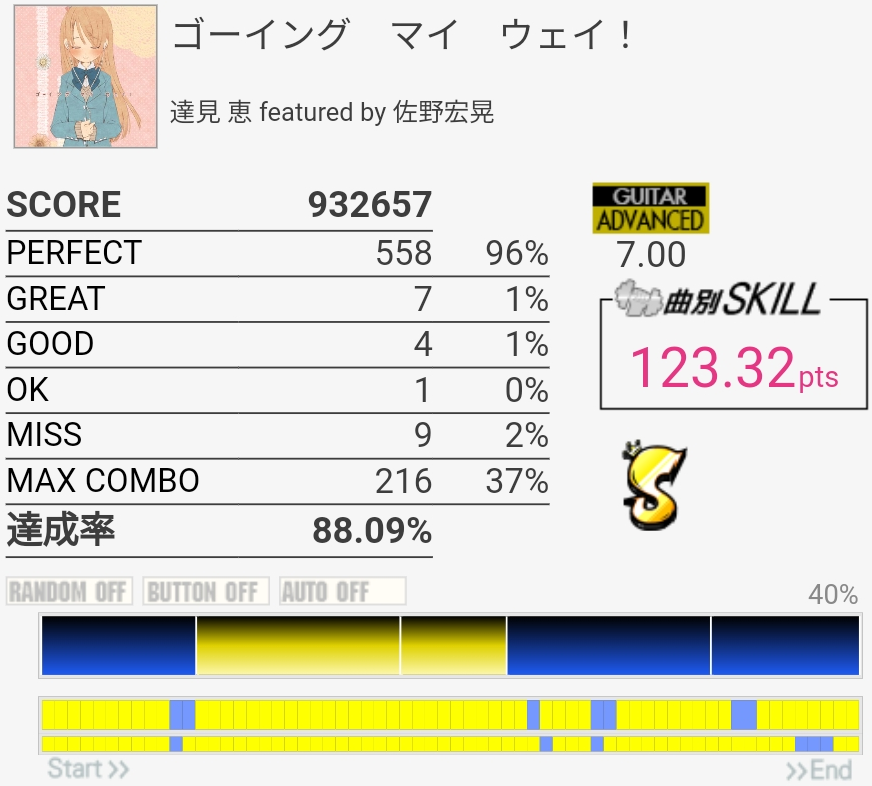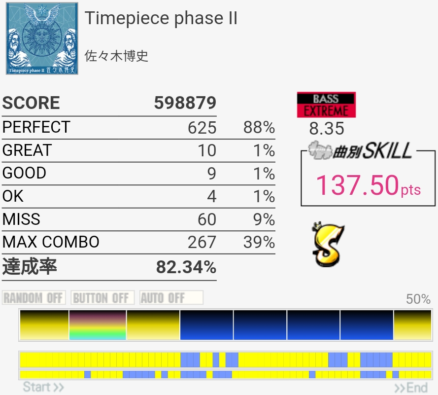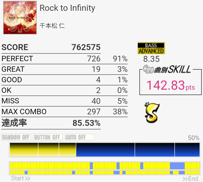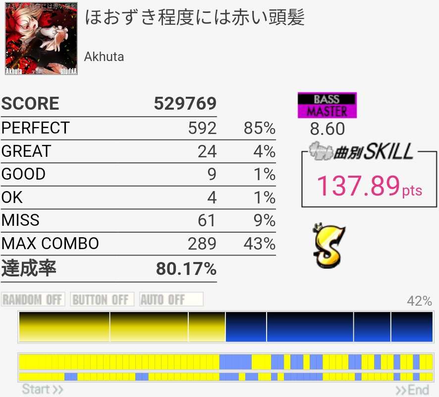 S取得。前半繋げられたのが大きい。サビの16分B→Rみたいな形はダウンで取ろうとしてめっちゃ切れたんだけど右手と左手どっちでミスってるのかわからん。