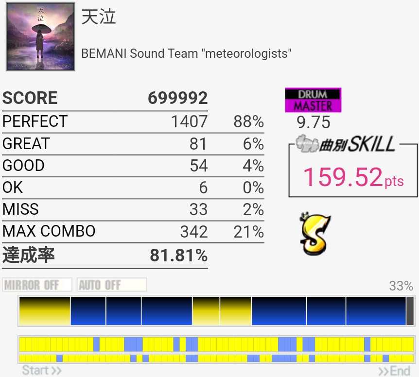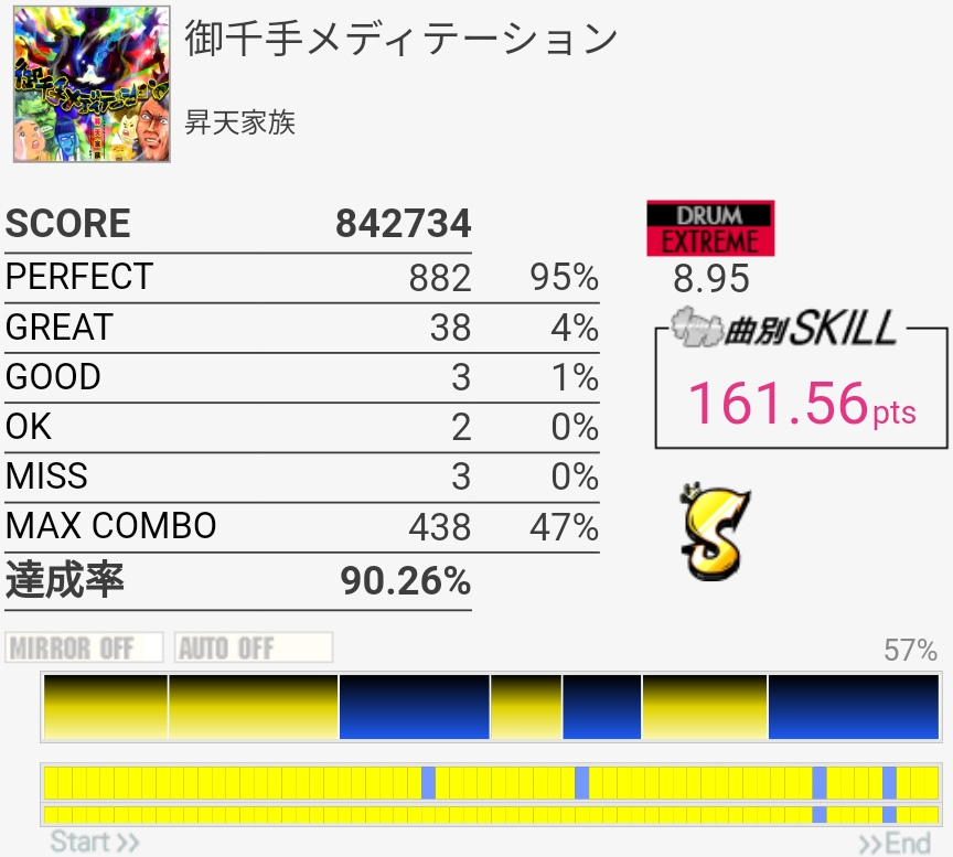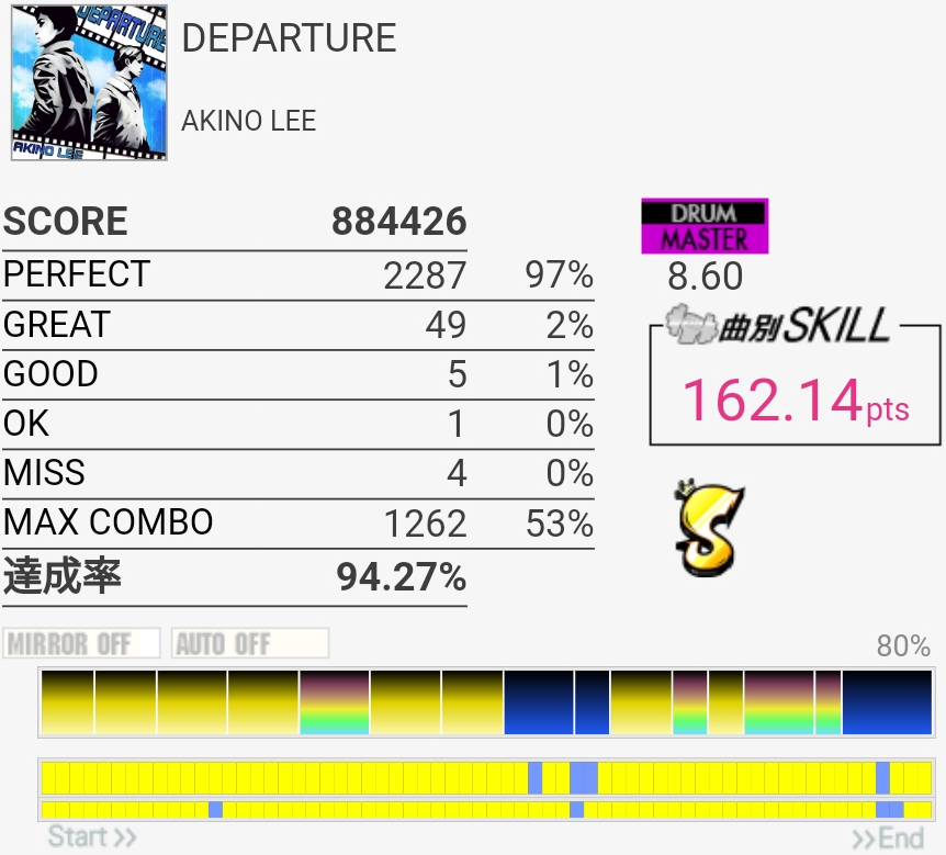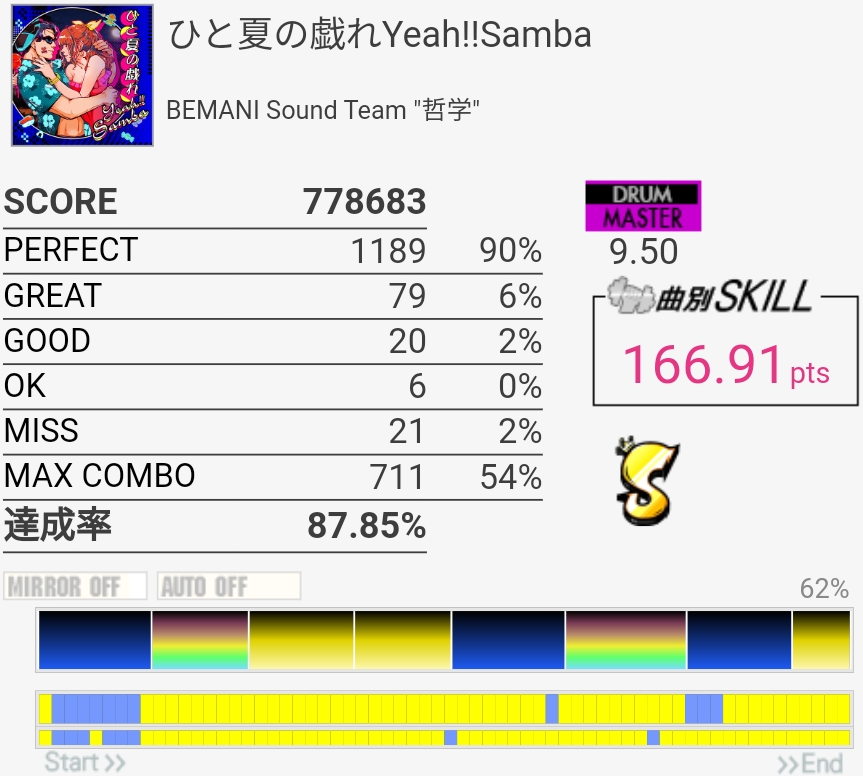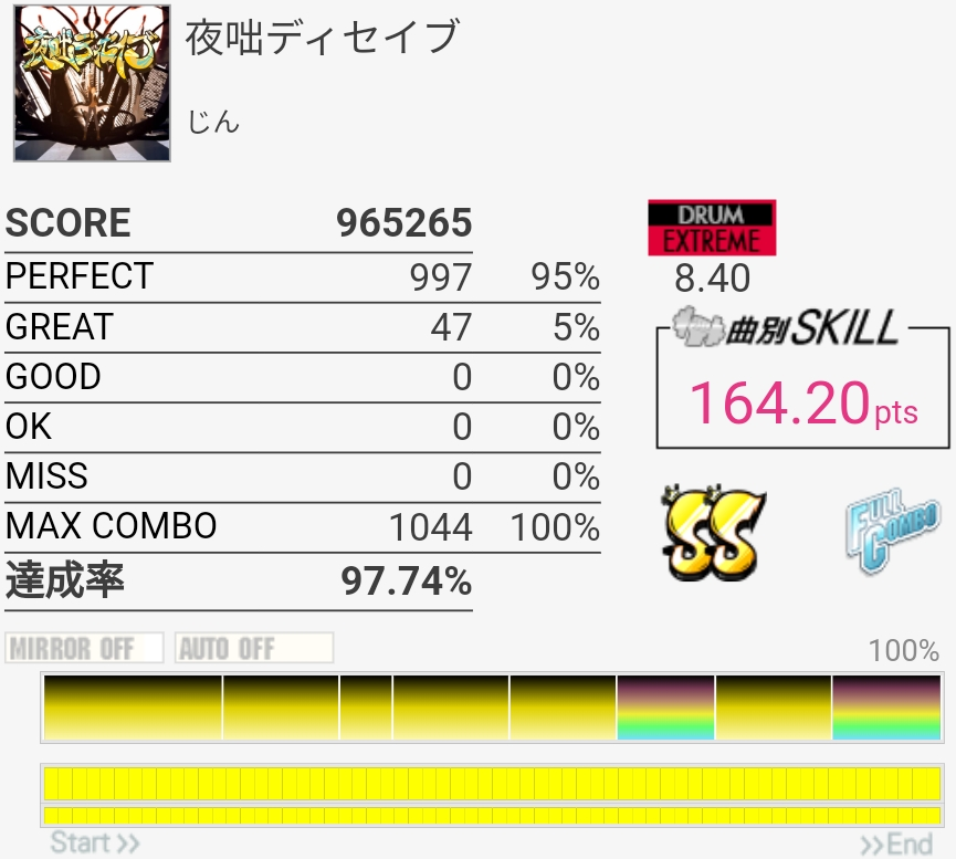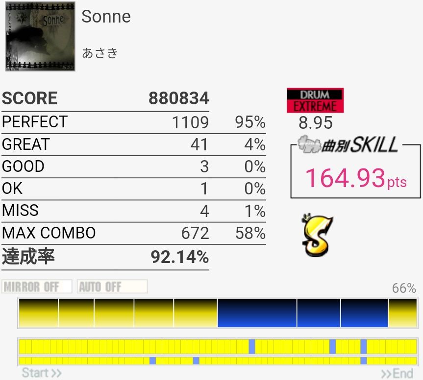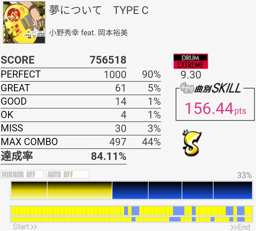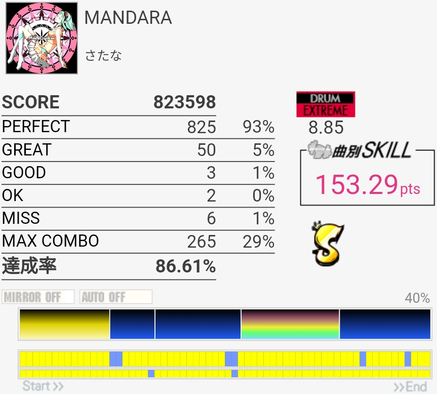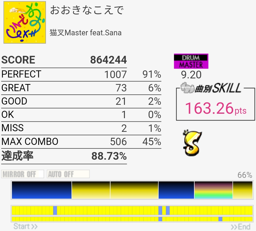 ずっとS判定すら怪しい感じが続いてたんだけどハネを意識しすぎてCY叩くのが遅いのかなって思った。いつもよりちょっと速めを意識したら後半いい感じに。