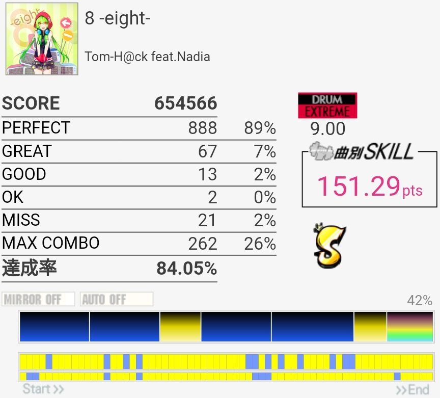 ここのFT全然入らん……反応おかしいんじゃないかと思ってしまうが。FT地帯苦手すぎて全部GREATな勢いだからもっとパフェ率上げなきゃ。