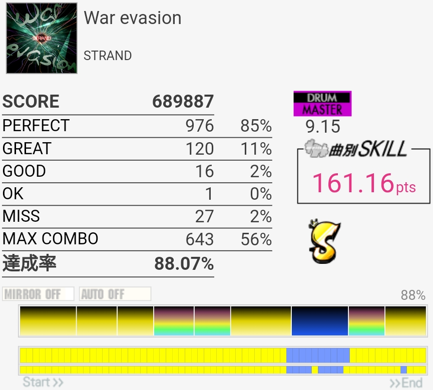今日のWar evasion。入りの時点で速さ合ってなかった気がする。もうちょい返りが強いペダルならがんばれる気がする……。