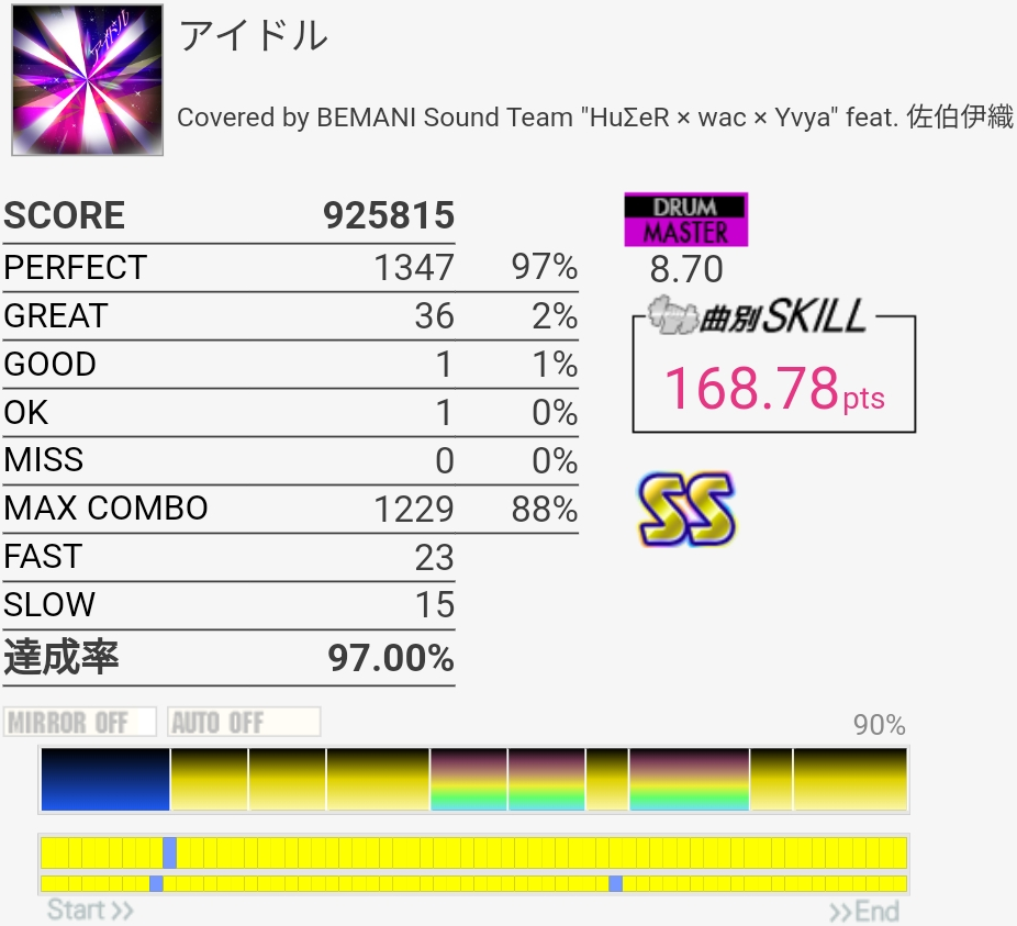 この曲、自分は筐体の感覚がバッチリハマってないと打ち損じたりパフェ率が終わったりするので具合を知るのに便利。