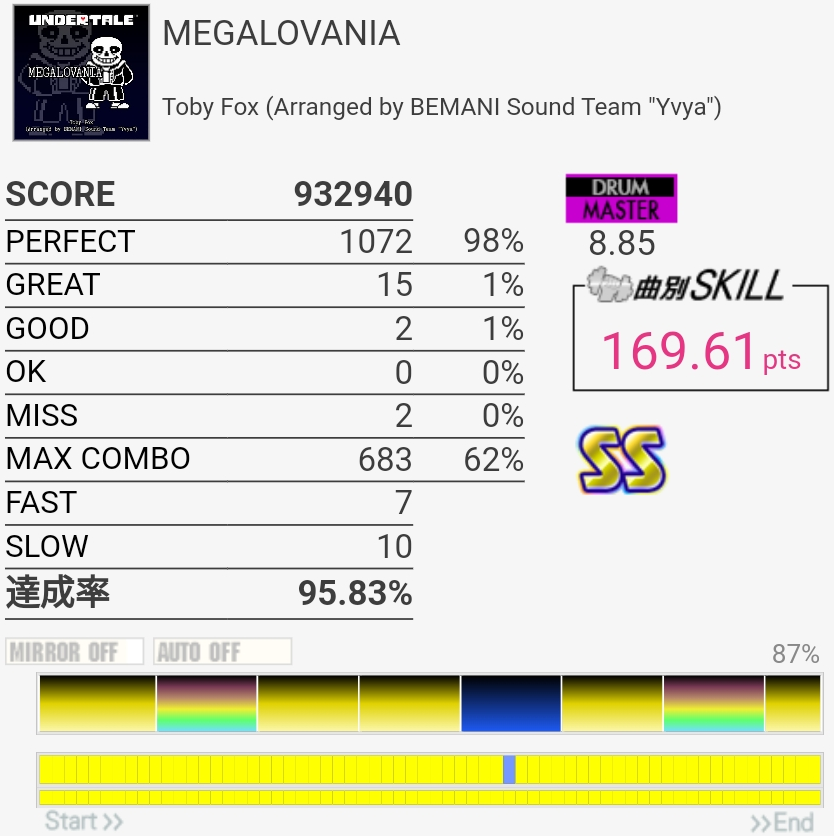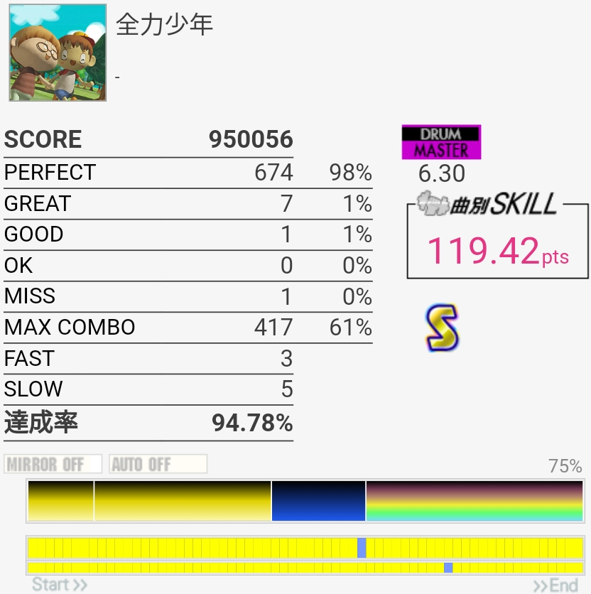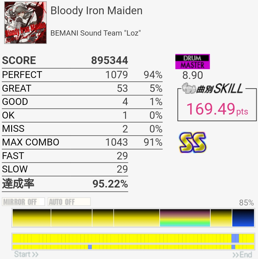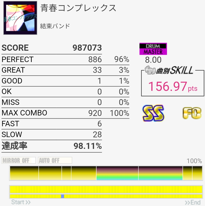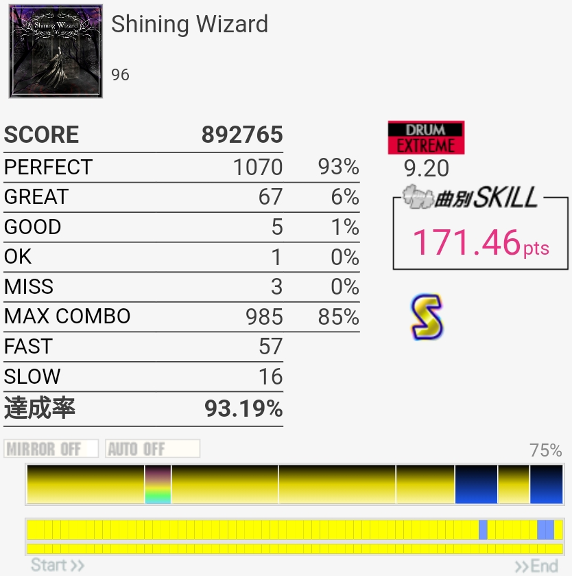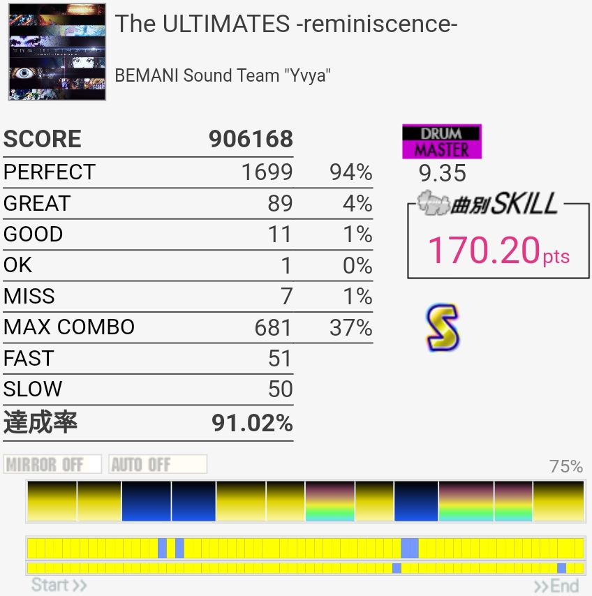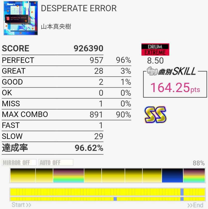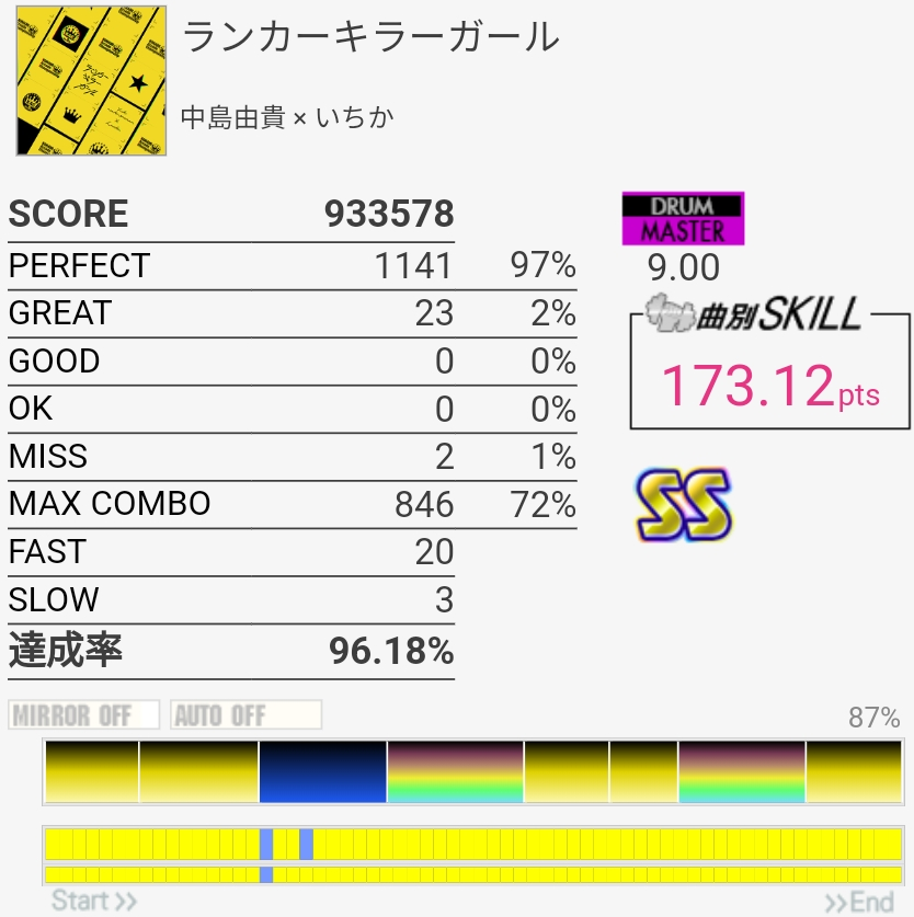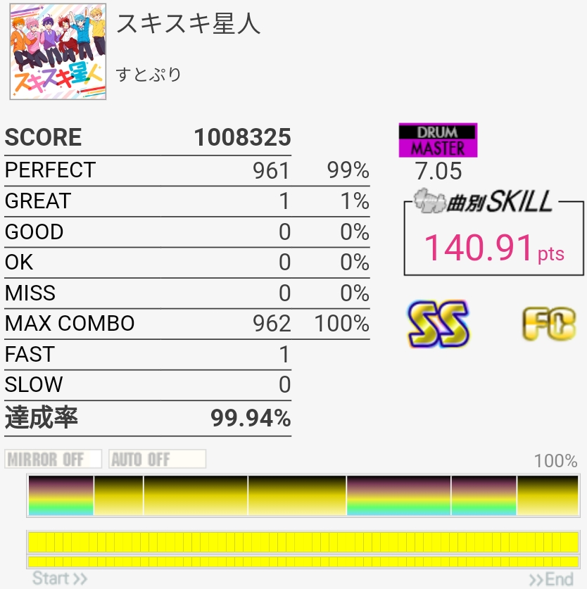 いきなりSS取れたのはびっくり。パフェ率低すぎて170点取れなかったけど……前半苦手すぎ。最後の部分は繋ぐの諦めてるけどちゃんと覚えるかなあ。そういうの潰していかないと上手くなれないのだと思う。