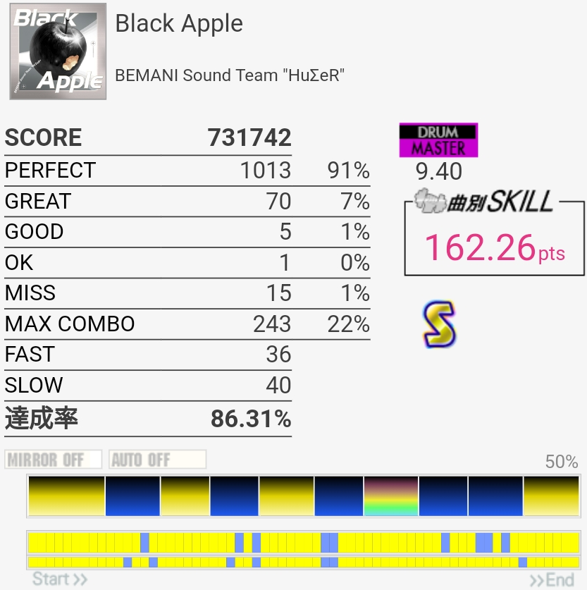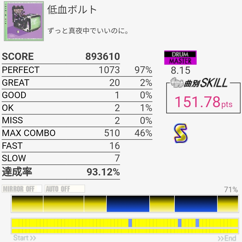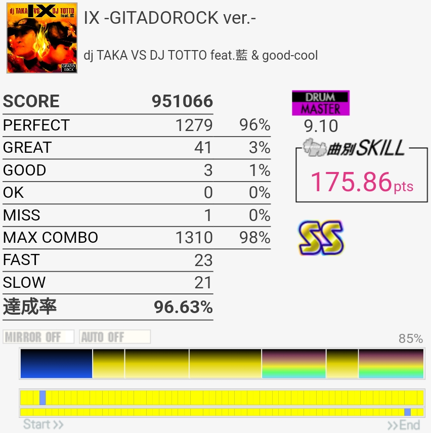 削除曲その2。なんか記憶よりめちゃめちゃ良譜面だな?16分HHがいっぱい来る以外全く覚えてなかったけどフィルは素直なので叩きやすかった。サビでいきなりダンスビートになるのと後半唐突に裏SNが来る部分はヤバい。