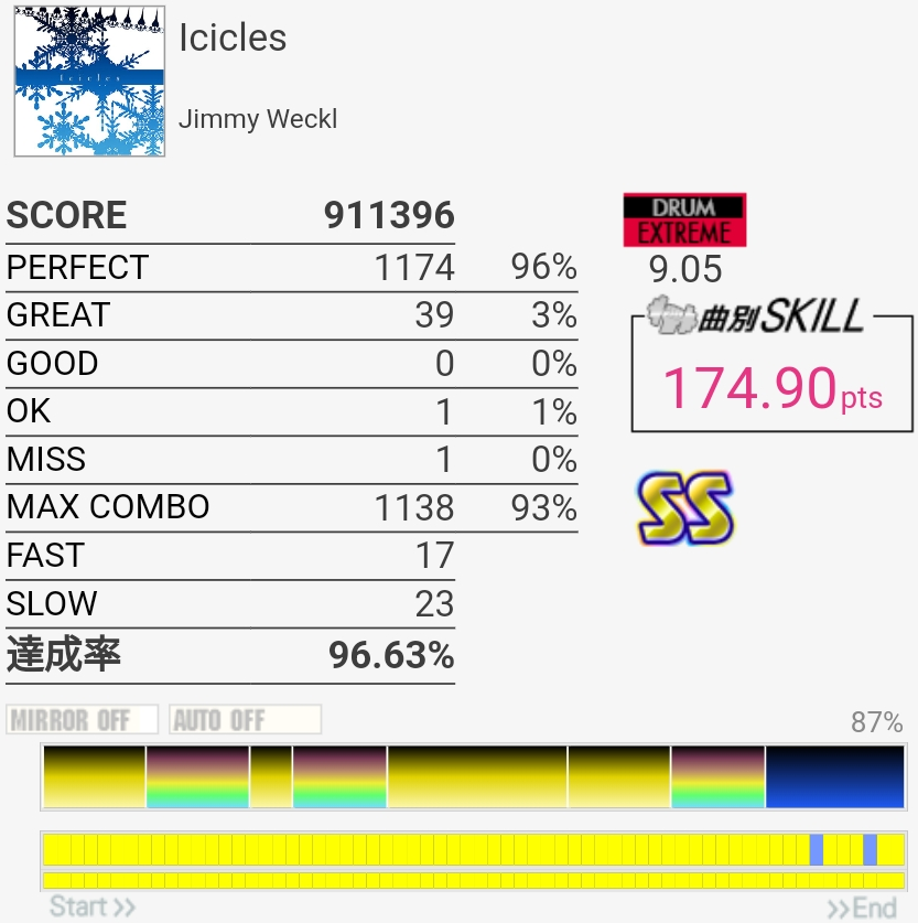 パフェ率まあまあだったけど最後で疲労に負けた。174点と175点には大きな差がある……。
