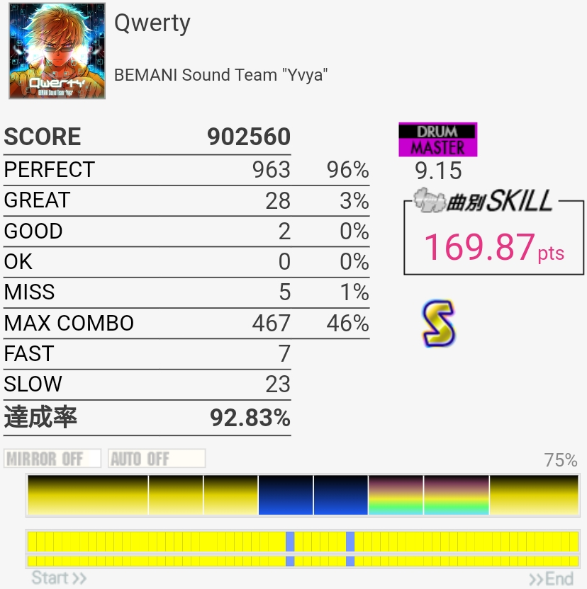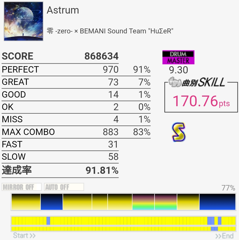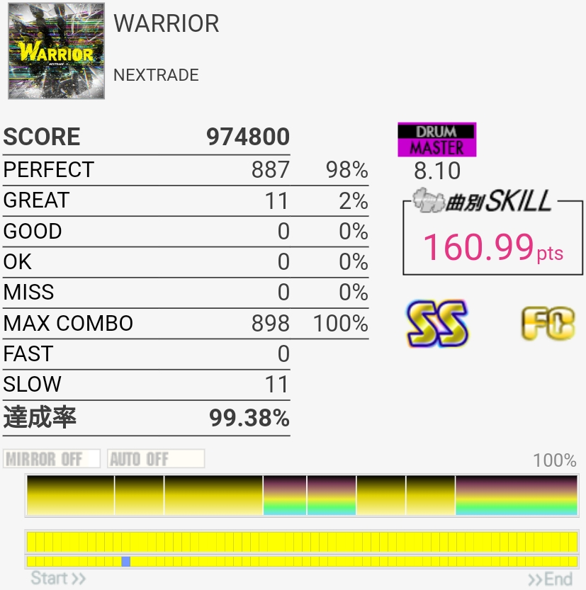 フルコン。パフェ率低い気もするけど前SS出した時よりはよかったわ。ツーバス地帯抜けた後のCYとBPの絡みが緊張してるのもあって意外と難しいんだよな……ツーバス地帯途中の(CY×2)×2は片手だとどうも叩けないので両手交互で叩いた。