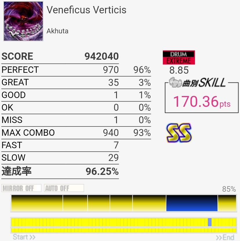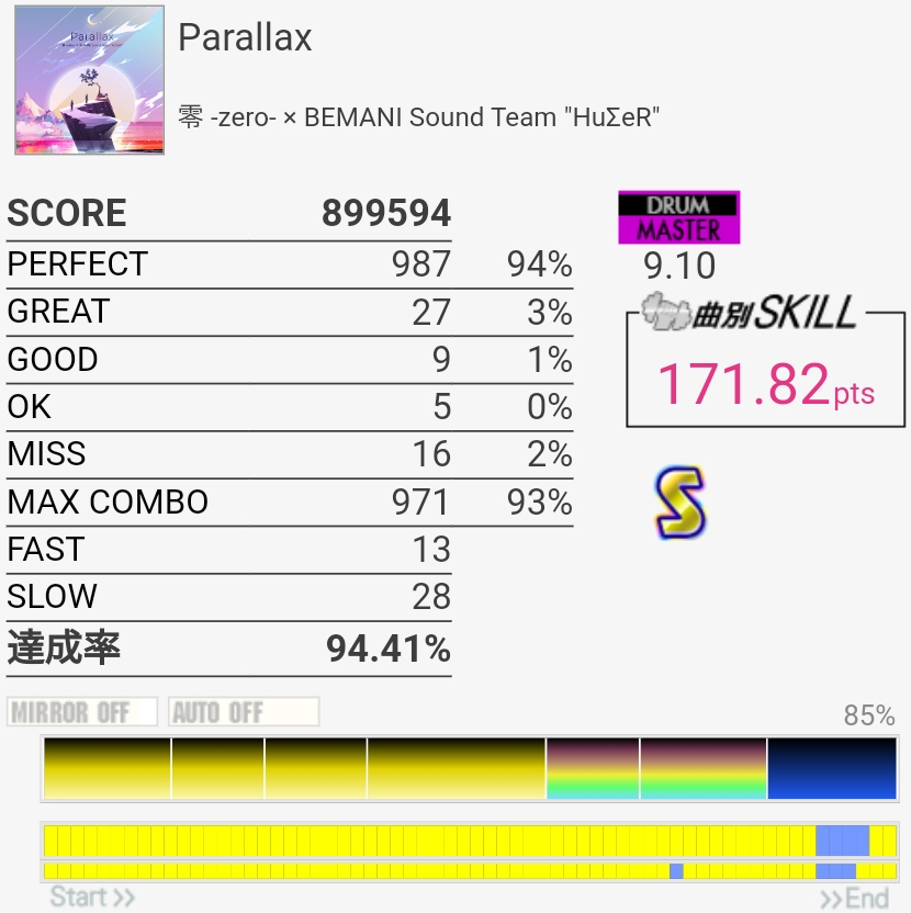 最後のツーバスの速さマジでわからん!粘着しすぎてパフェ率が90%いかないことも増えてきたのでちょっと放置した方がいいのかも……。