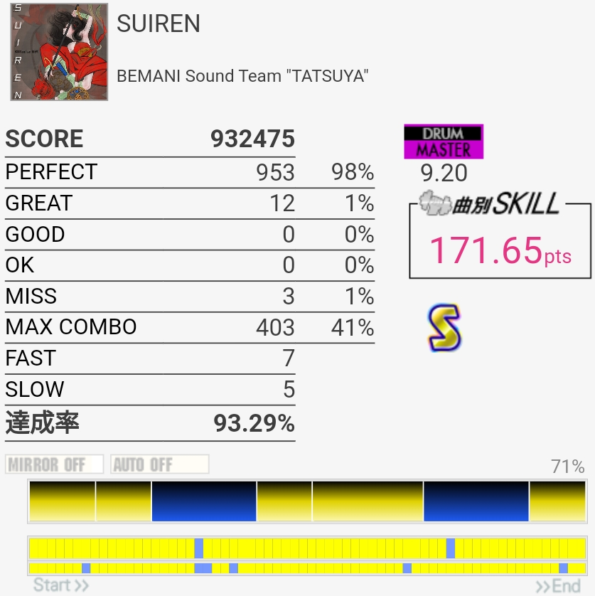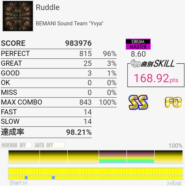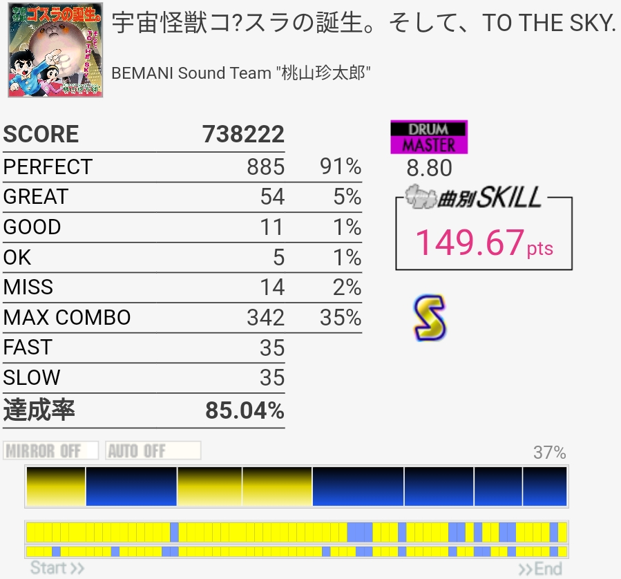 繋ぎ直して99%。ギタフリでベースEXT譜面をやったおかげで2個ツーバスが3回だとかリズムを理解できたのでかなりうまかった。最後のフレーズで5個くらい出ちゃったのが残念だけど……これでスキル1点上がったおかげでかなり気持ちが楽になったのが大きかった。