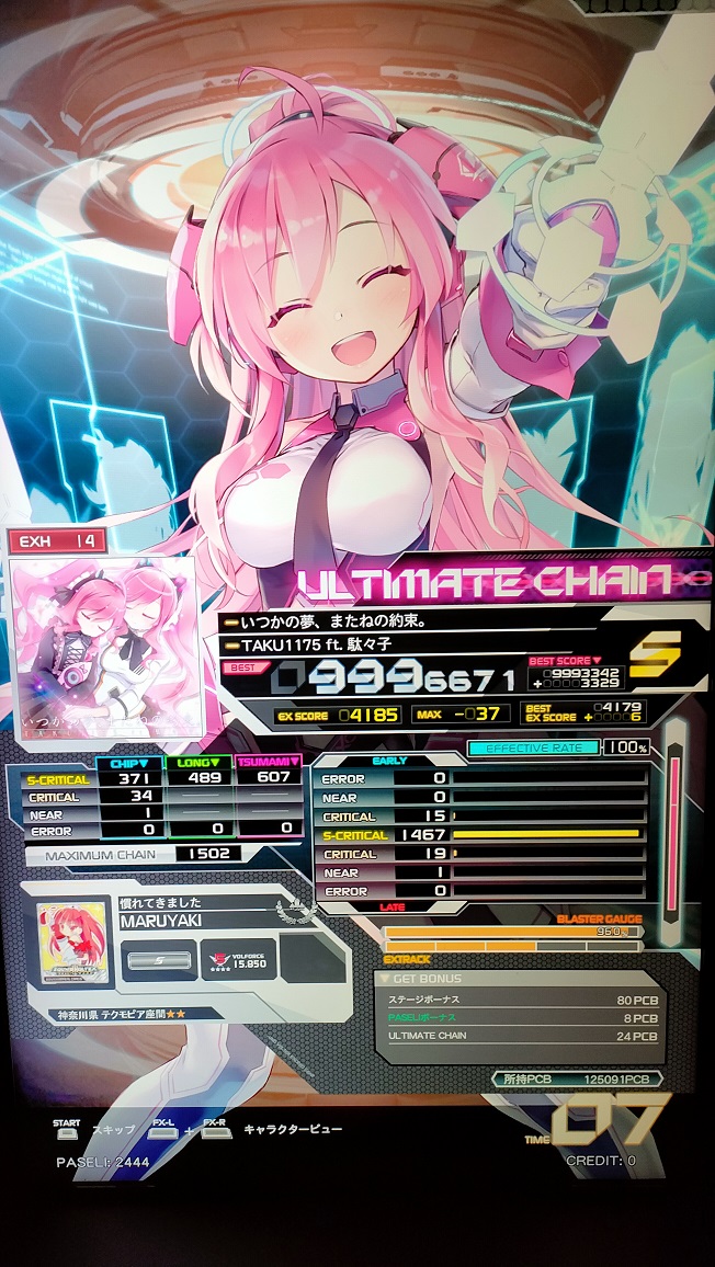 これ大好きな曲なので、毎回PUC狙って粘着してるんだけど16分でNEARが1・2個出るか、NEARが出てないときに限ってツマミが抜けるのを繰り返してる。粘着すると精度がどんどん落ちていくし一発で決めるしかないのかな。