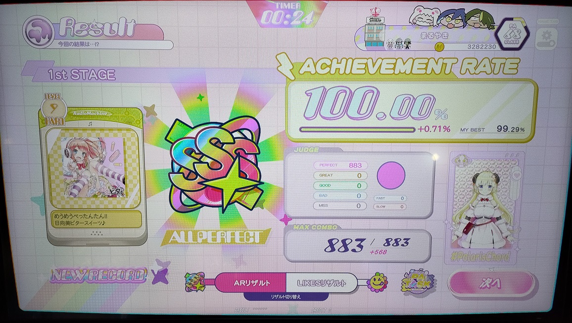 AP。アプデ入ってからリザルト画面見やすくなったね。最近追加されたLv9の譜面がややこしいのばっかで早くもレベル表記が飾りになってない?って思う。