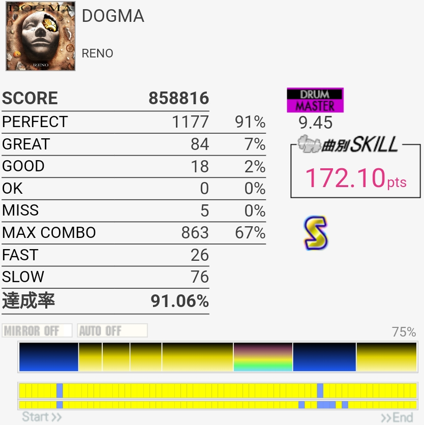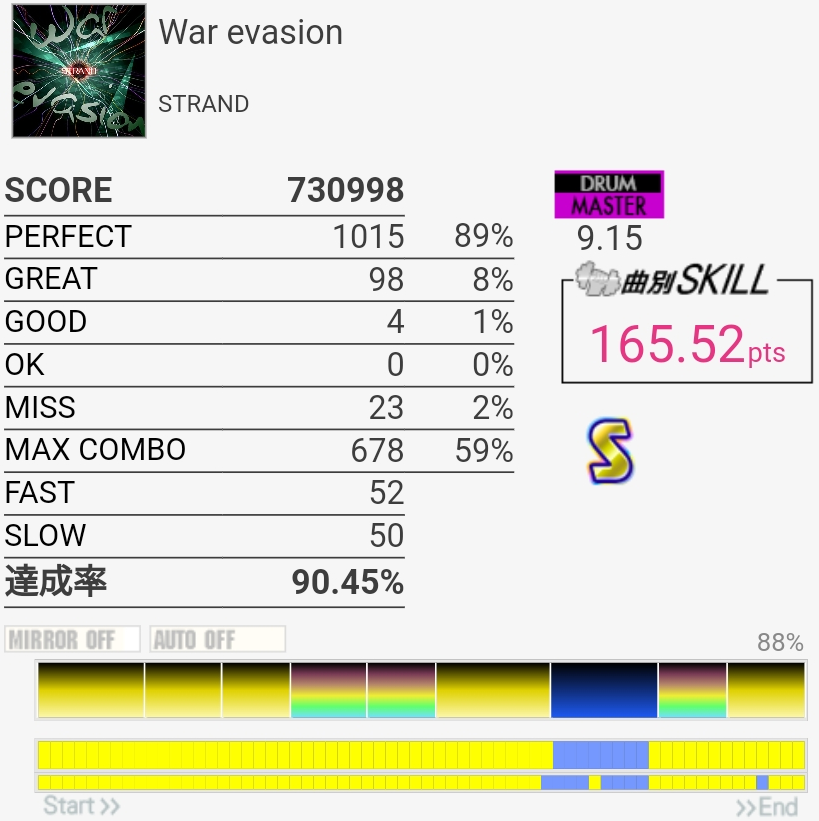 初見で90%取れたからびっくりした。局所難とはいえ9.45は高すぎでは……?2回来るBP連打は適当に踏めば繋がりそうな感じだけどその間のツーバス踏みながら不規則CYが意外と崩れやすい(苦手)イントロに密度高い連打があった気がするけどそこが最難所だろうか。ツーバスで崩れるとパフェ率終わるね……。