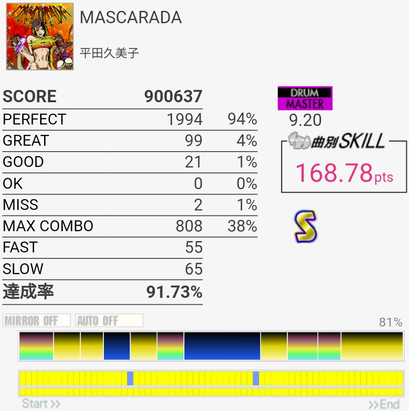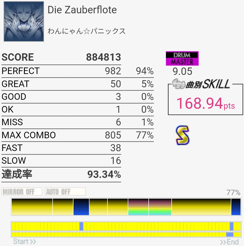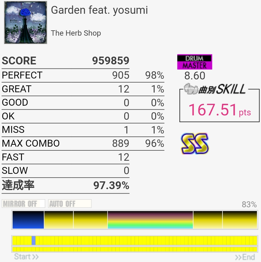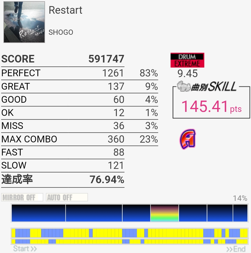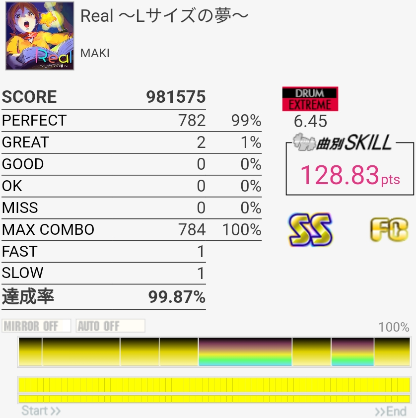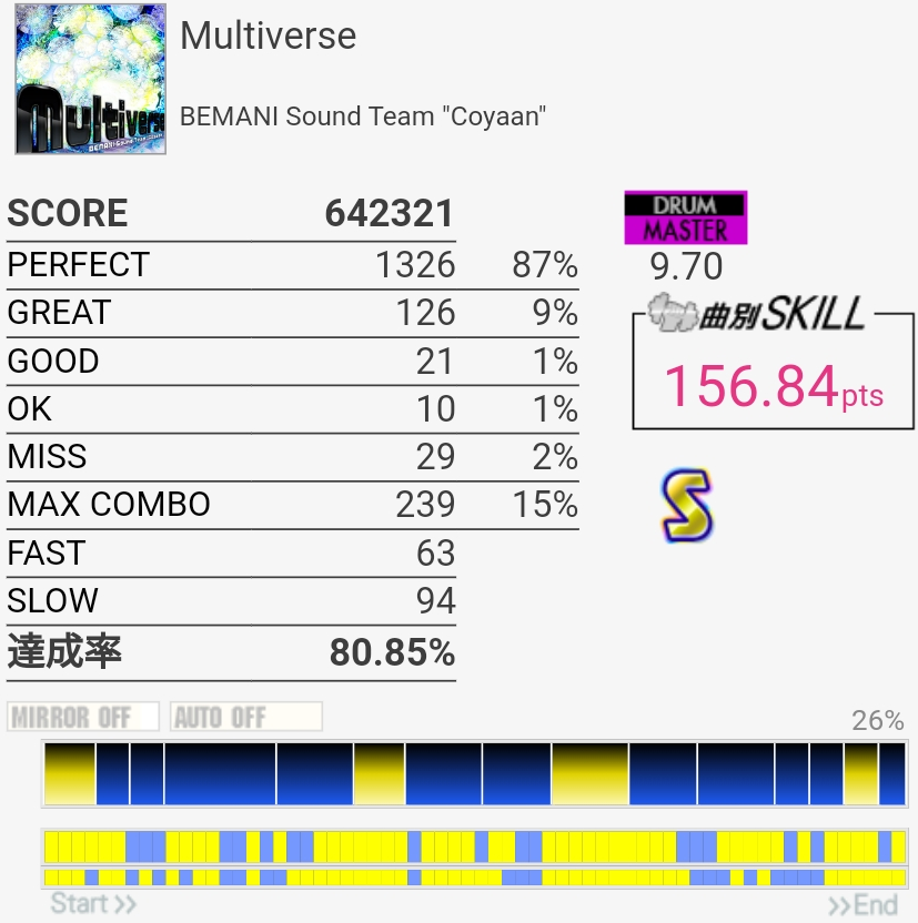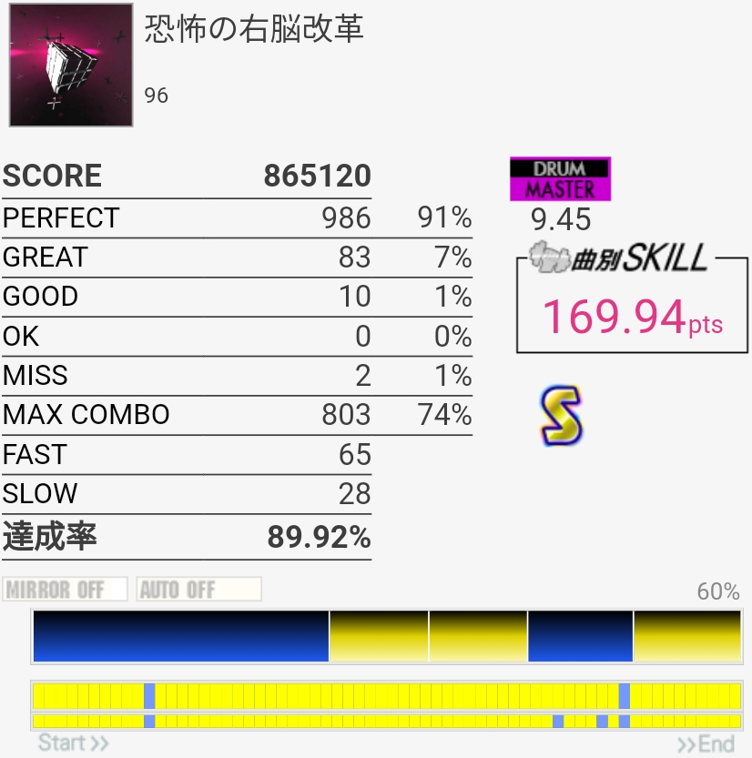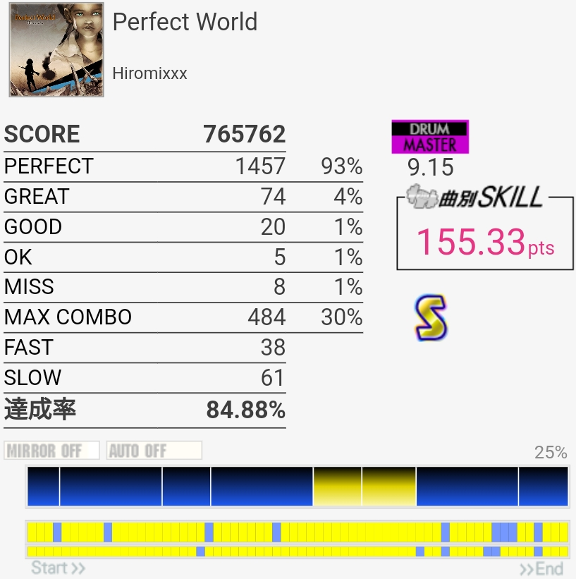 惜しい……のか?イントロのBP×2はこの速さだとつま先で踏む方がいい感じだという気付きがあったので伸ばせるかも……パフェ率もうちょい上げないとSS乗らないね。