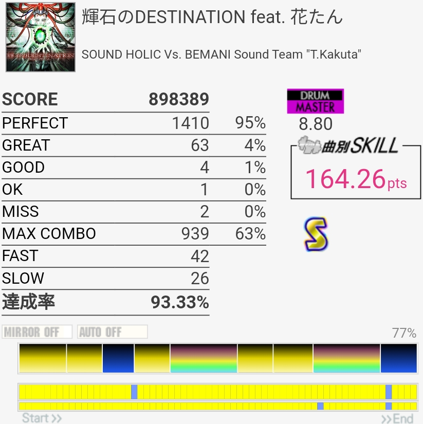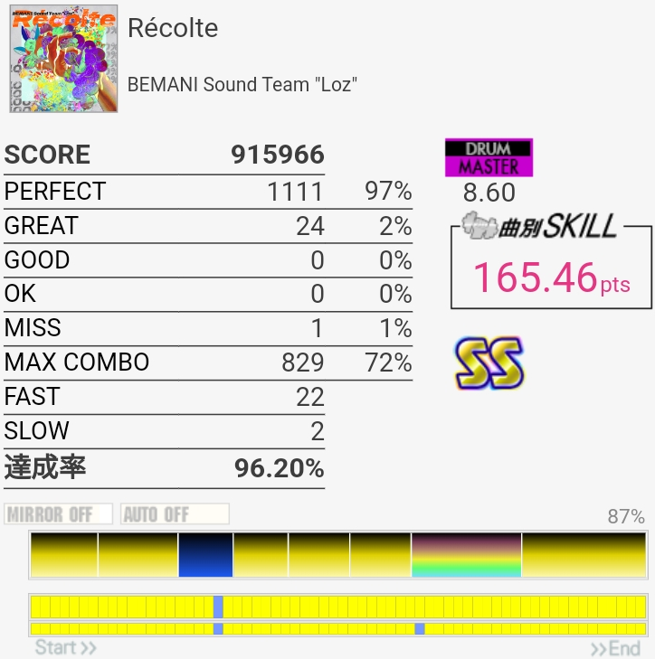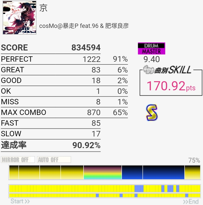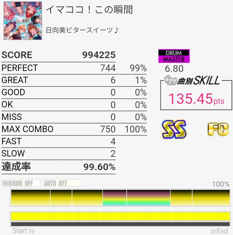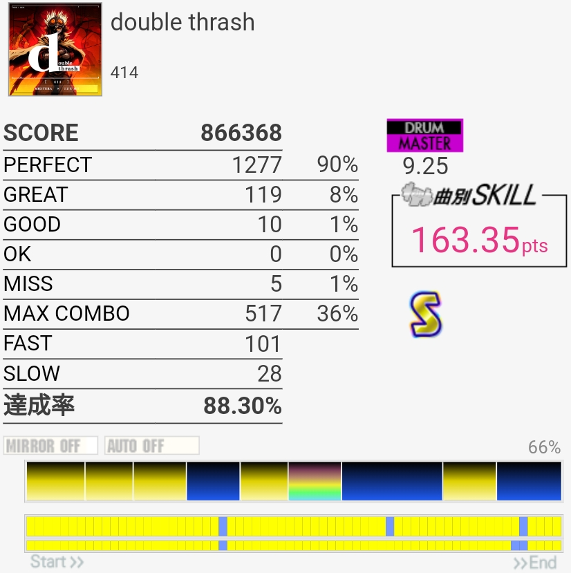 放置してたおかげか前半はしっかり叩けたけどSNが抜けてしまった。ツーバスの速さは相変わらずわからん。