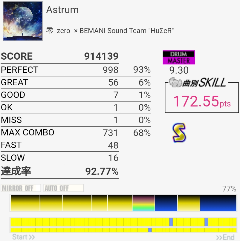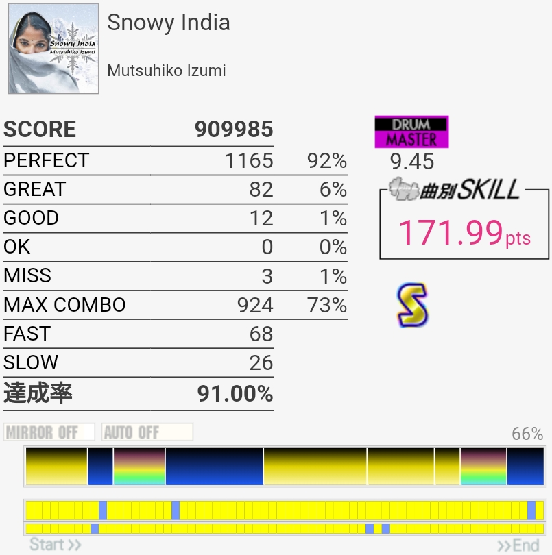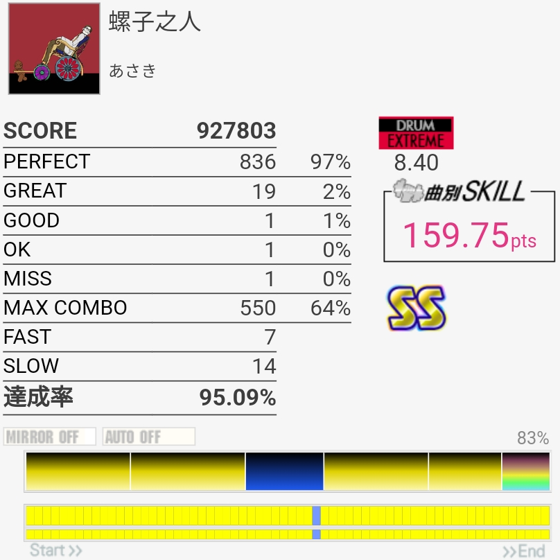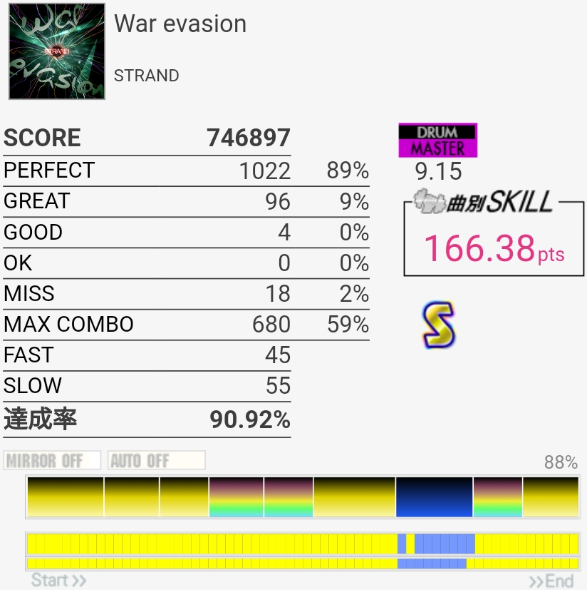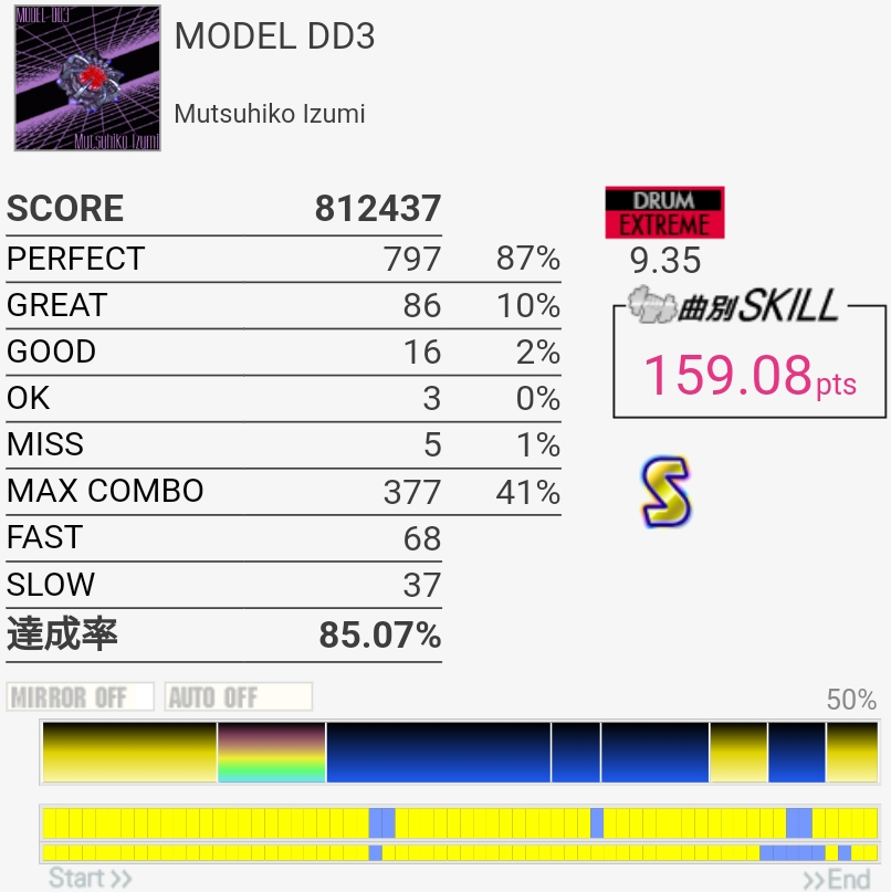 放置してたおかげか前半はしっかり叩けたけどSNが抜けてしまった。ツーバスの速さは相変わらずわからん。
