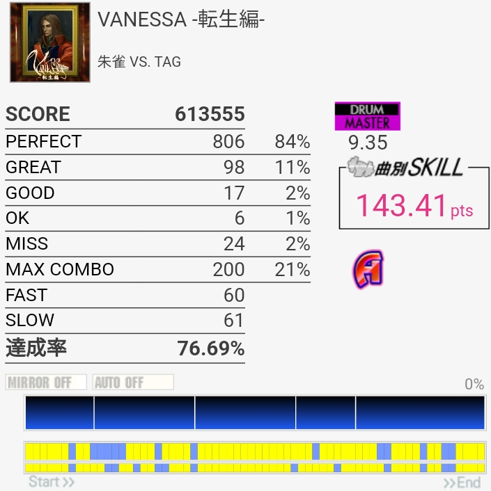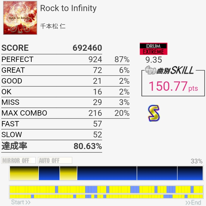 SN×4→HT×4→LTのバケラッタが入らん。他の曲でもよく切るんだよね……どういうミスり方してるかわかんないんだよな。