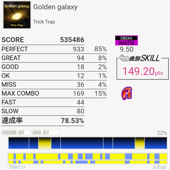 譜面忘れてたけど5フレーズ目の前半はプレアン当時の記憶より叩けるかな?って印象だった。後半は頭おかしい。こういう系統のゴリ押し譜面に向き合わないといけない時が来てる気がする。