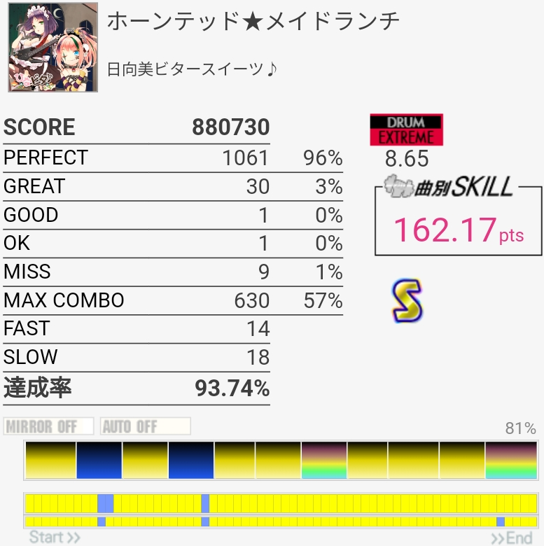 SS取得。今日はわりと腕に力が入っててタムをしっかり叩けたんだけど最後の16分SNからの同時で切ってしまった。ちゃんと叩いたと思うんだけどなあ。