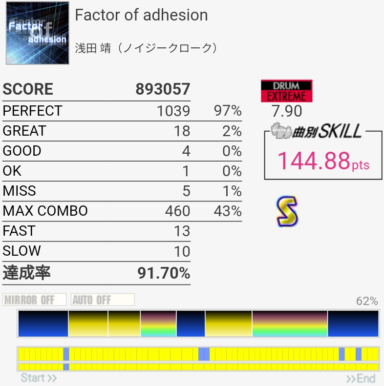 スキル8650超えた。稼働長くて稼ぎも多かったHIGH-VOLTAGEで8632だったのでそれを普通に超えられてるのは嬉しいね。今作も割と稼げる曲多いけど……。