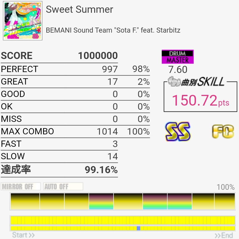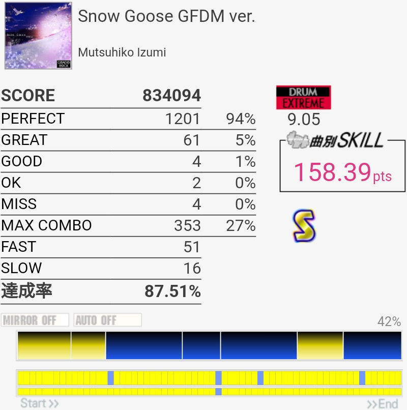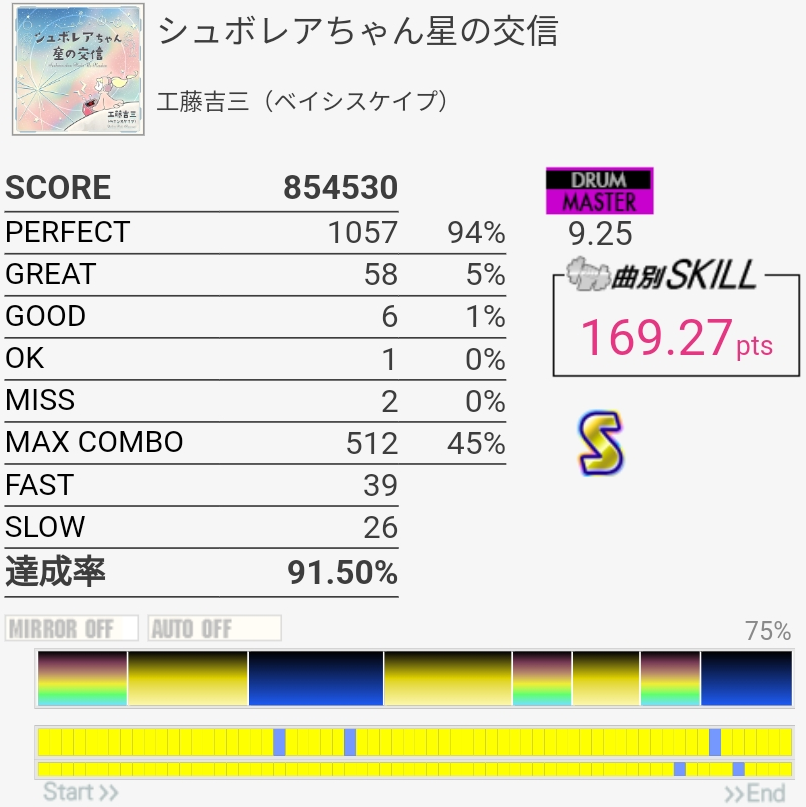 99%に乗せようと何回かやってるけど毎回ラストで切ってる。後半から入るツーバス部分も若干変な癖がつきかけてるんだよなあ。