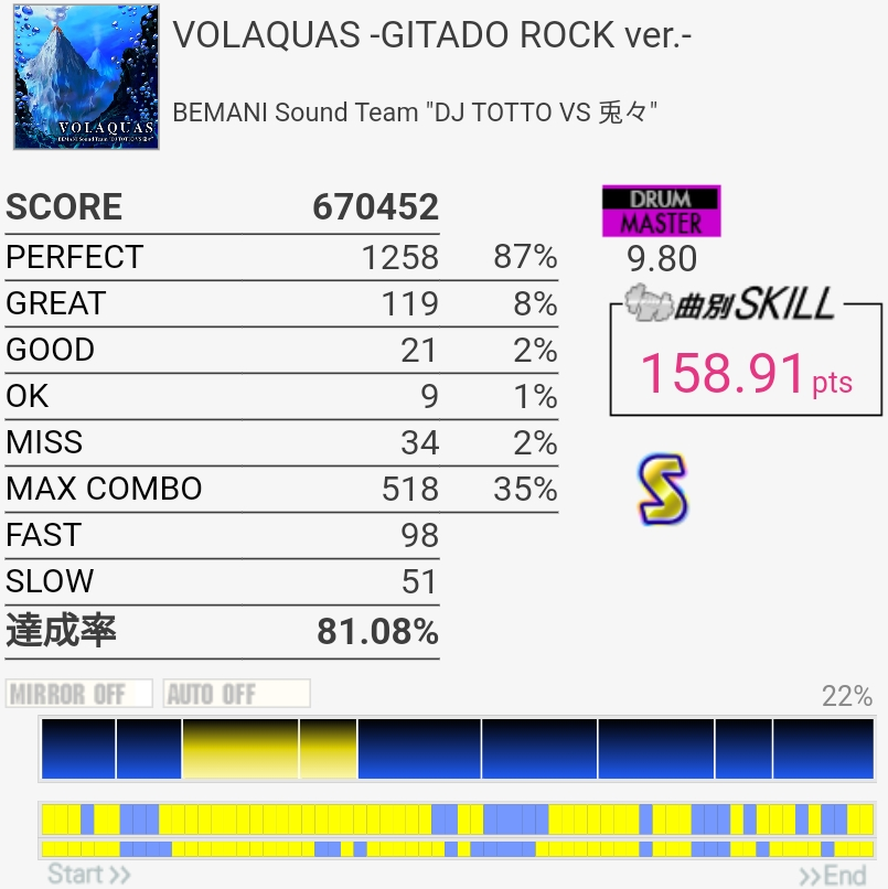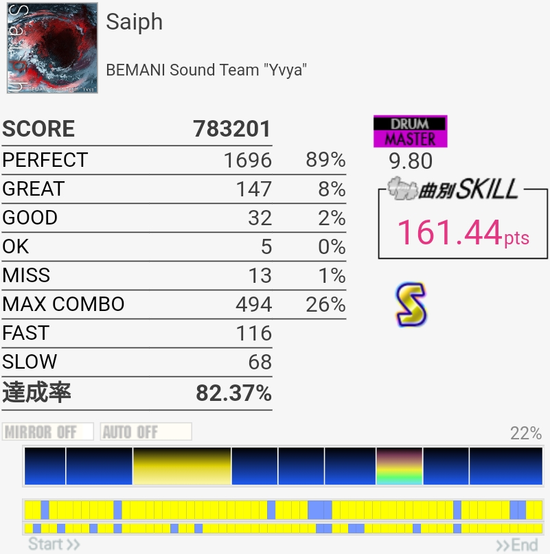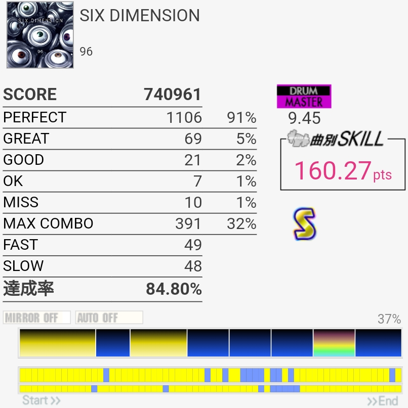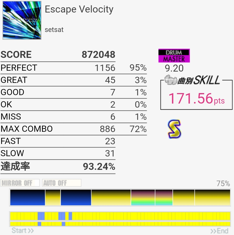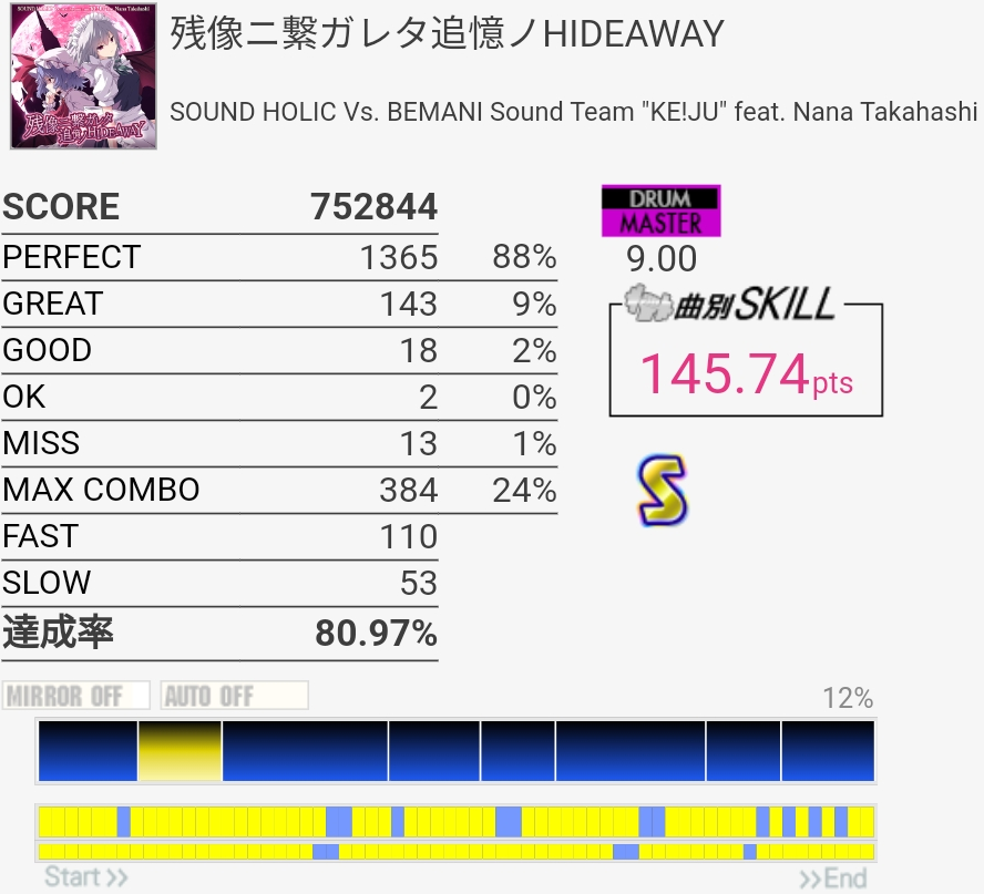 S取得。三連符地帯が繋がったのがデカいね。このBPMでも一打一打しっかり叩いてから次に移動する意識を持たないと次を叩こうとして手が迷っちゃう。