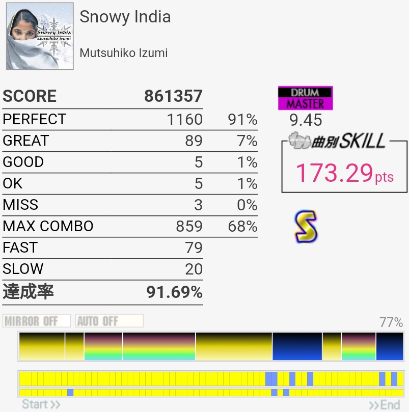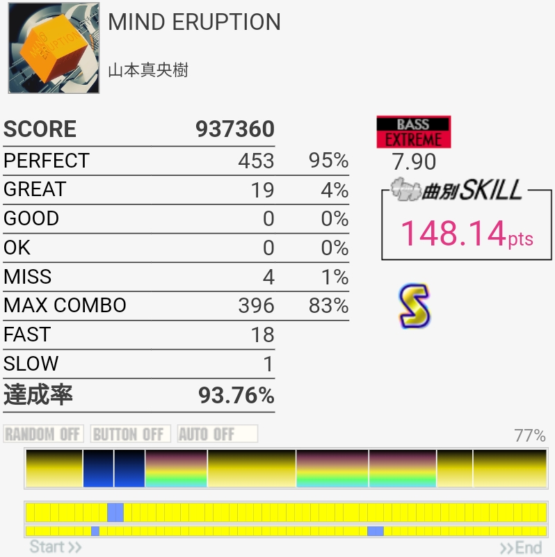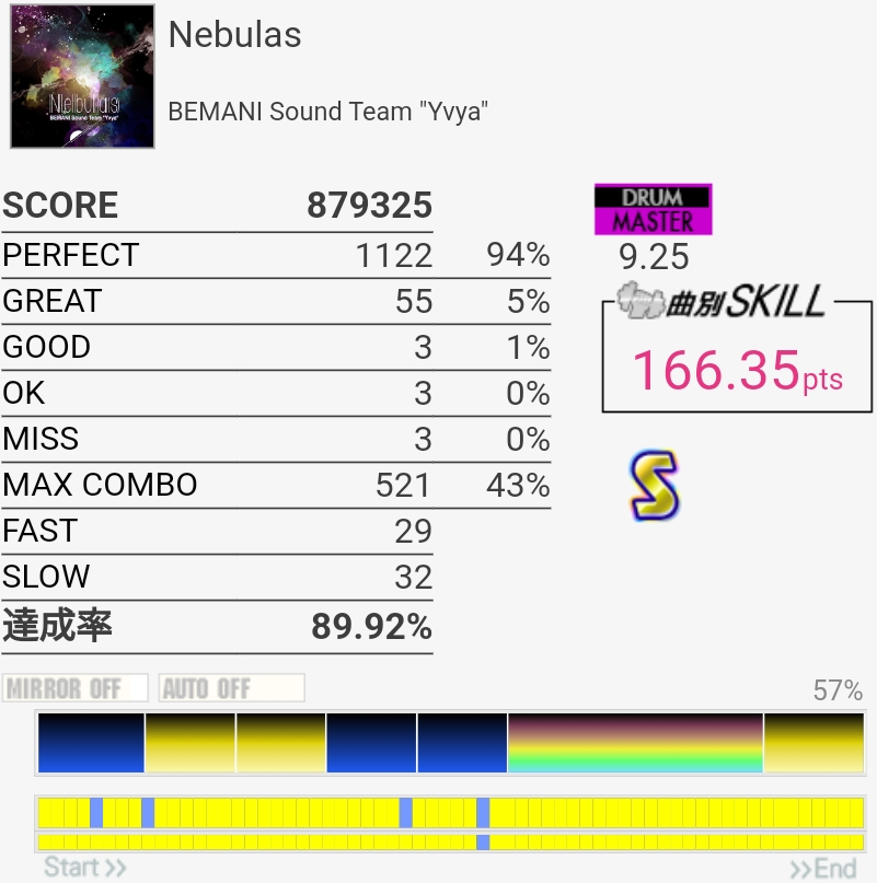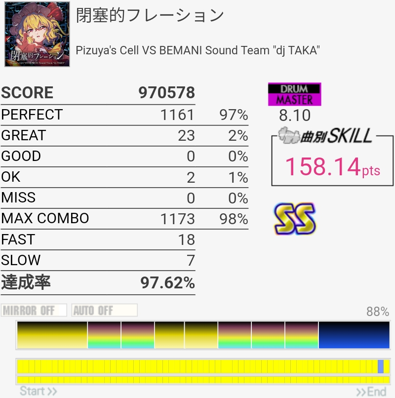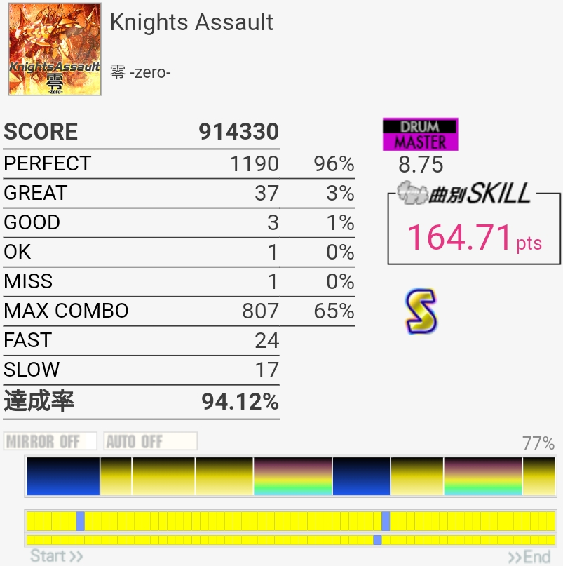 S取得。三連符地帯が繋がったのがデカいね。このBPMでも一打一打しっかり叩いてから次に移動する意識を持たないと次を叩こうとして手が迷っちゃう。
