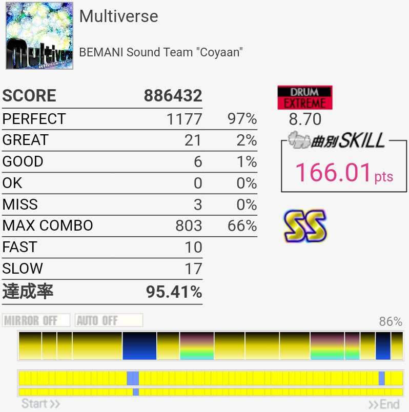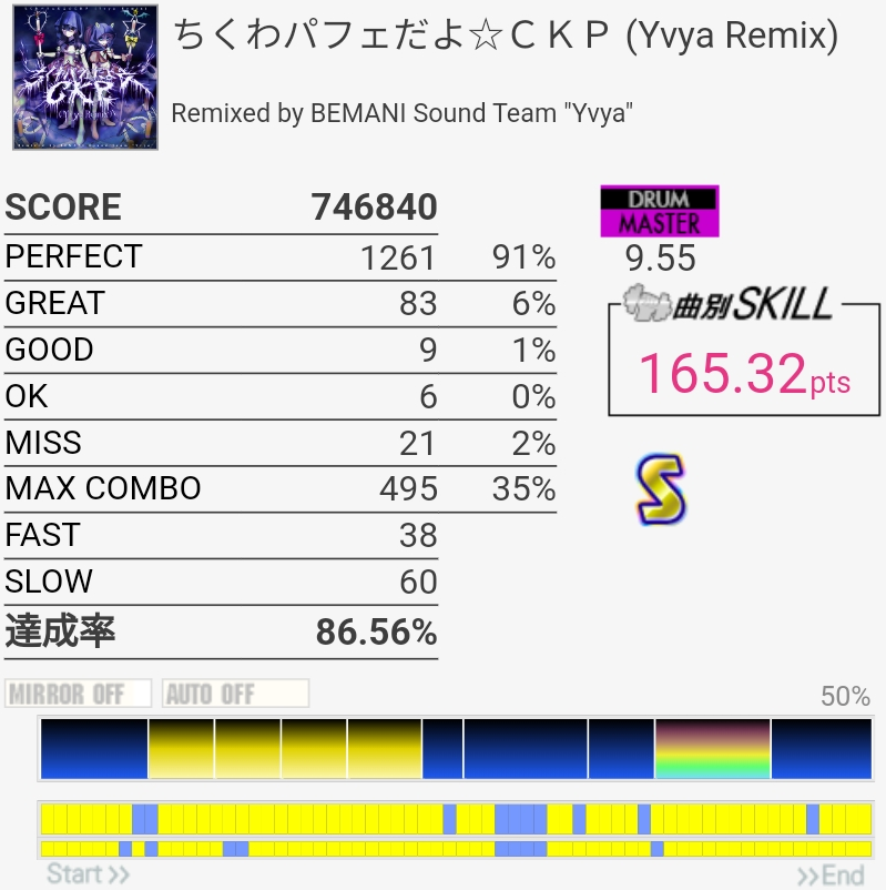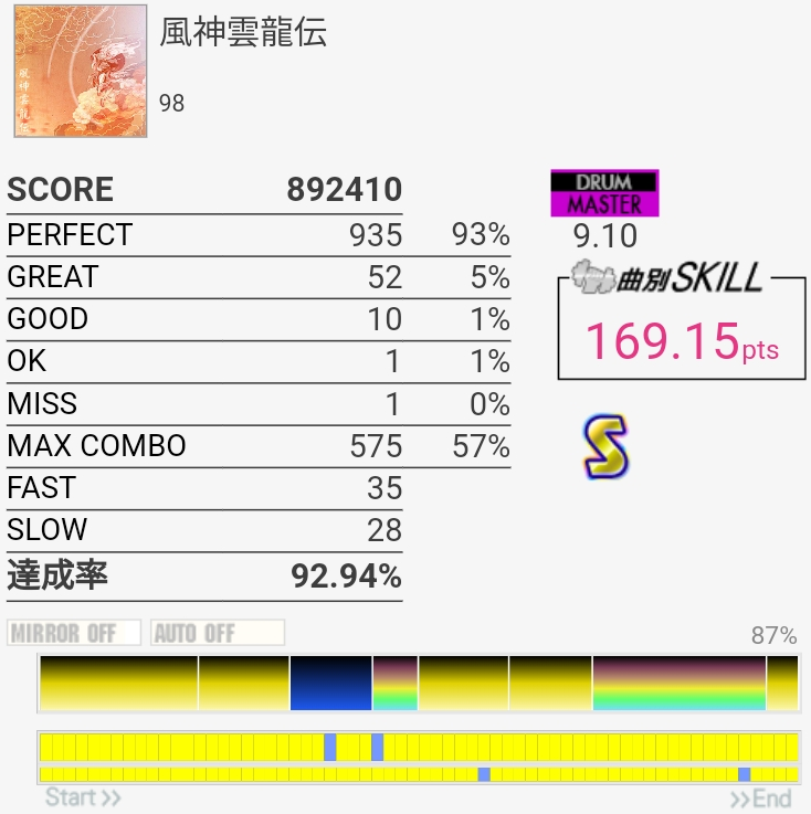 S惜しかった。イントロアウトロのSN×4はLLRLで取るのがズレなくていいかな?この譜面でキツいのSNフラムとCY×3なんだけど。