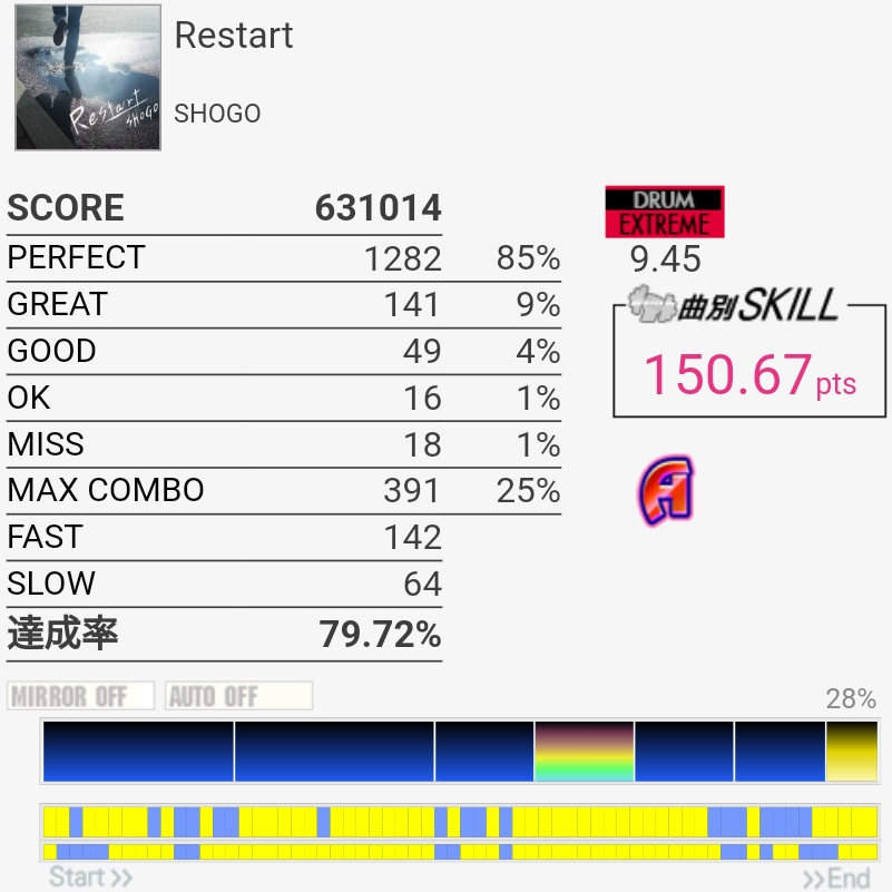 シャッターを1下げて試しにやってみたけど、譜面は見切りやすいけど足の感覚が合わなくて、あと反射で叩く割合が高くなると強打しがちなのでよくないと思った。中盤を右手ダブルで叩くのも試してみたけど全然しっくりこなかった。要練習ね。
