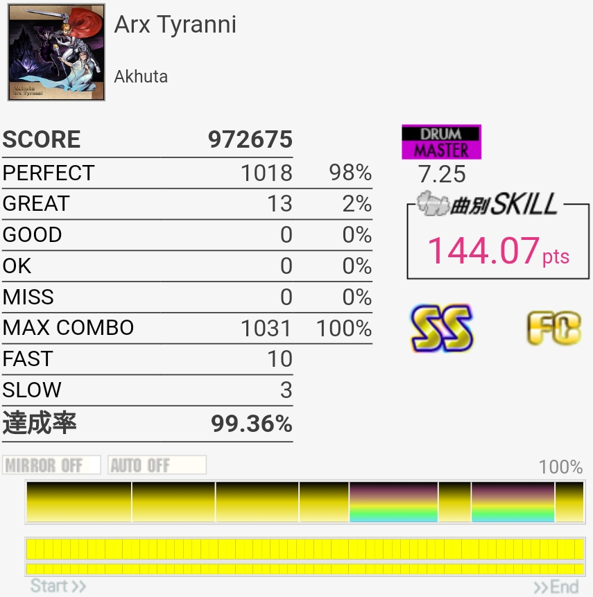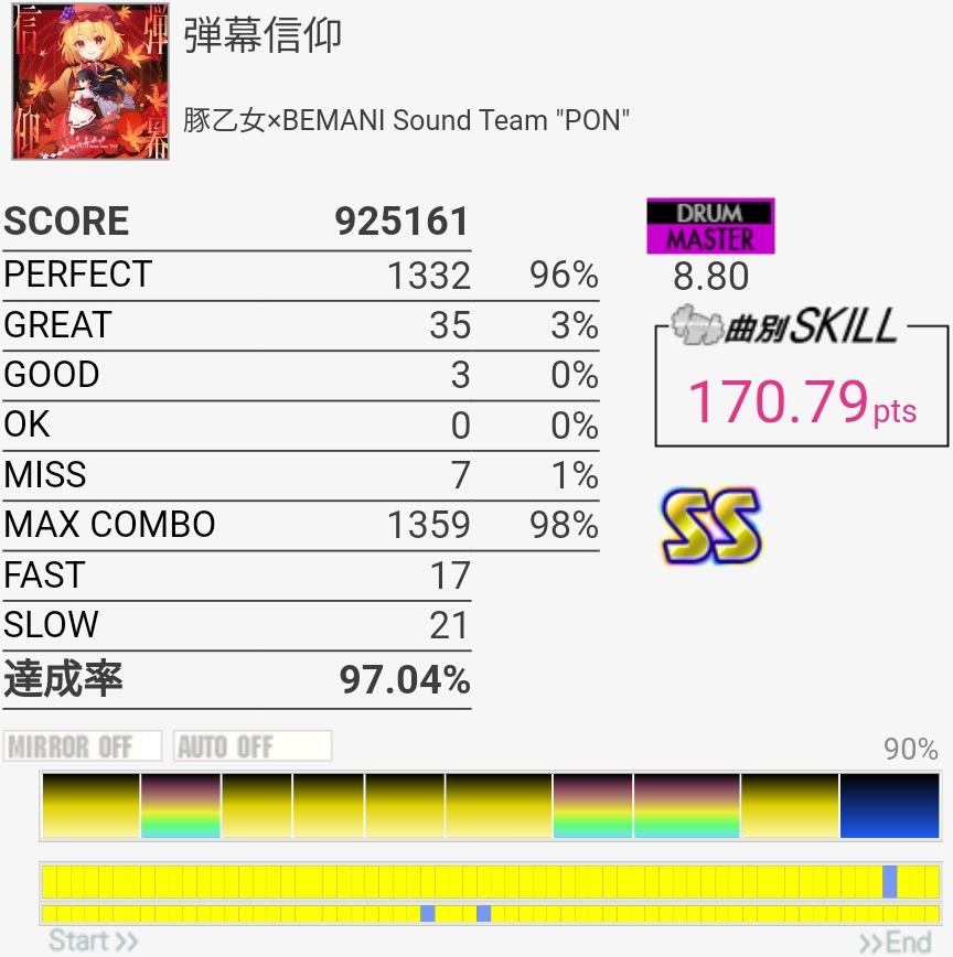優しい方のPON譜面。中盤の16分HH+裏SN絡みはリズムを覚えないとちょっと難しくて、パッドの跳ねなさも相まってスティックが引っかかりまくる。そこ以外は何回かやれば捌ける7台後半程度の譜面なのでかなり逆詐称だね。仕事終わりだからか打ち損じが多くて繋がらなかったけど……あと若干FASTに寄りがちだと思う。思ったよりBPM遅い。