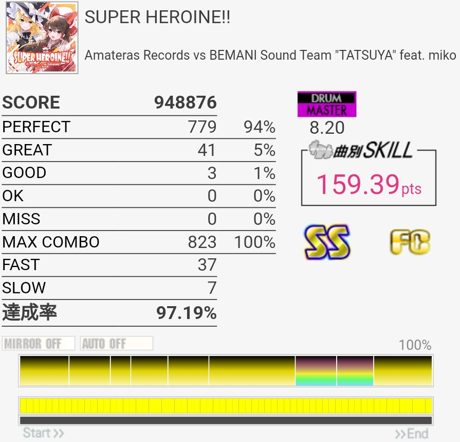 GOOD出なかったの初めてかも?長いSN連打はわりと叩けるようになったけどその後のリズムを何回やっても覚えない。