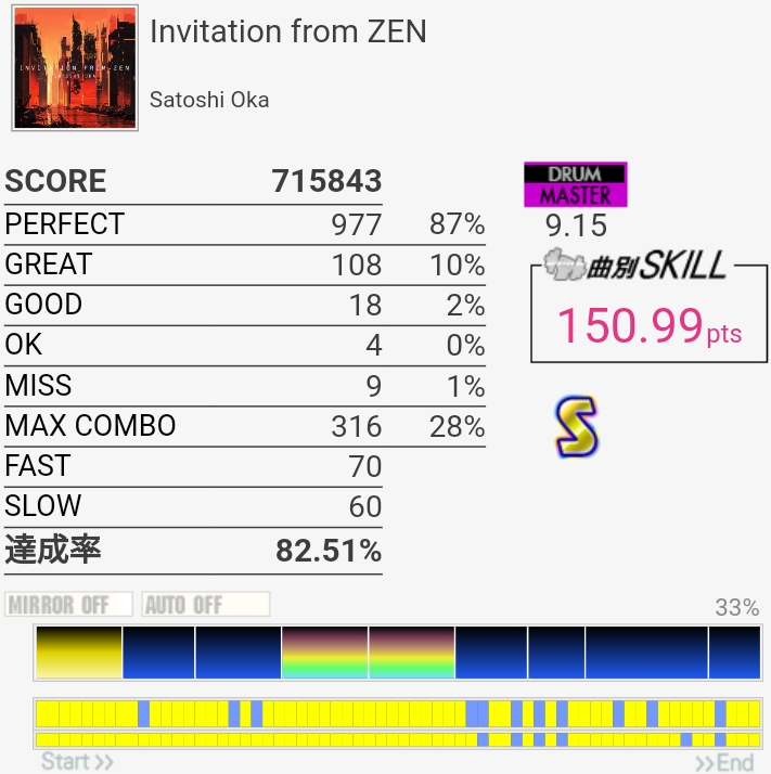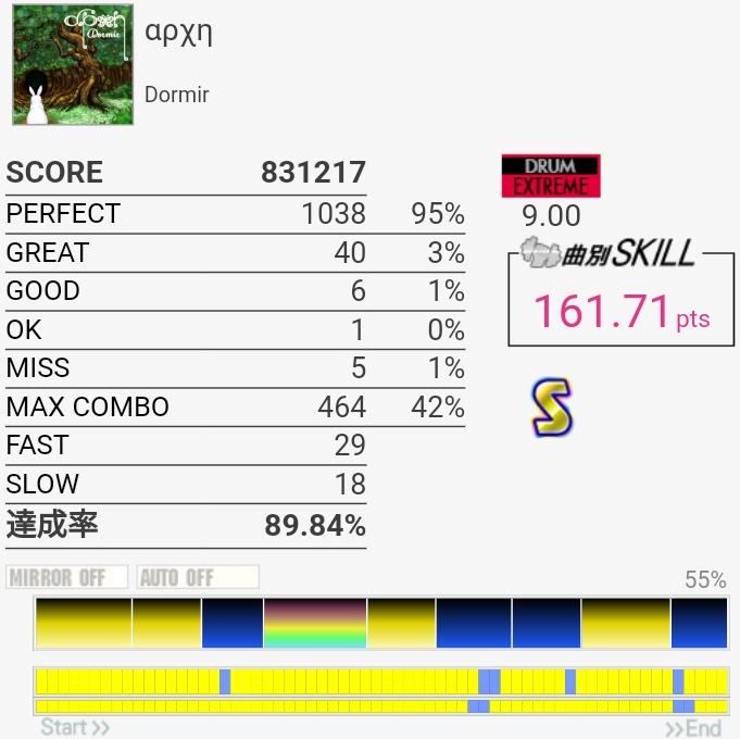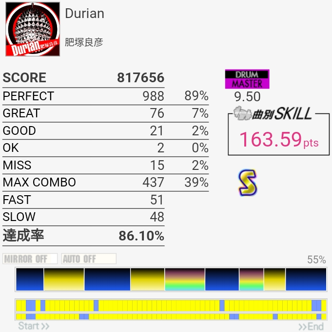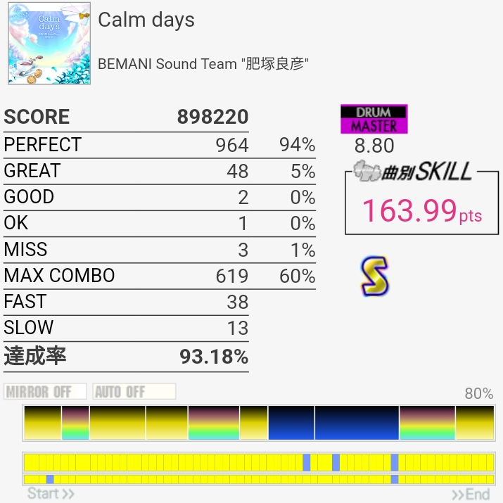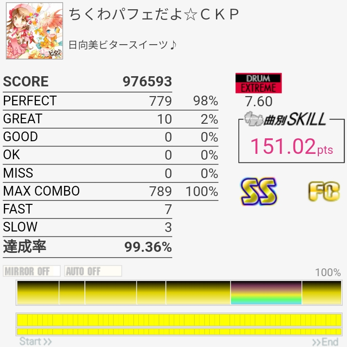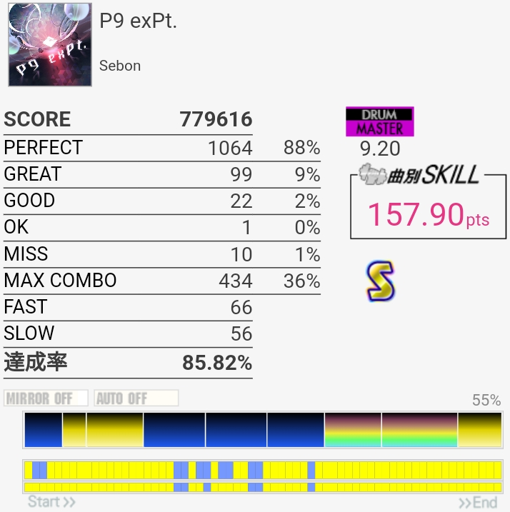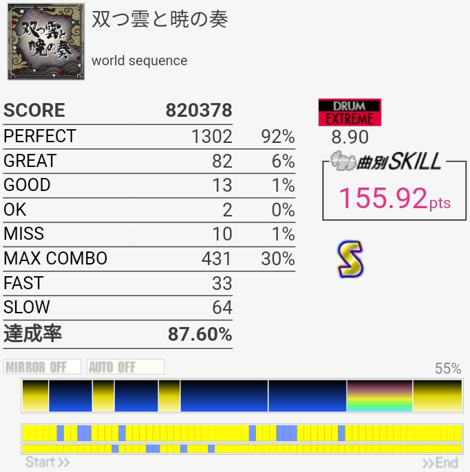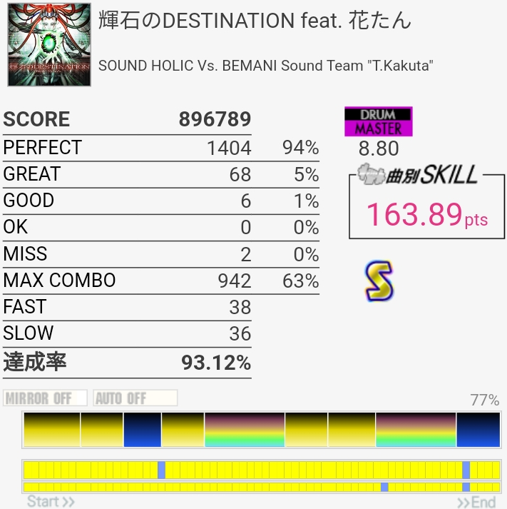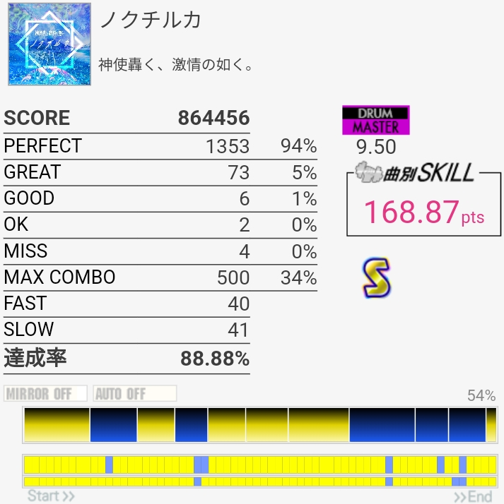 今までで一番上手かったかも。意外にノーツ数少ないから10個でもこのくらいの達成率なのか……。