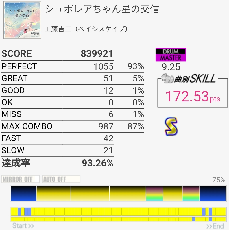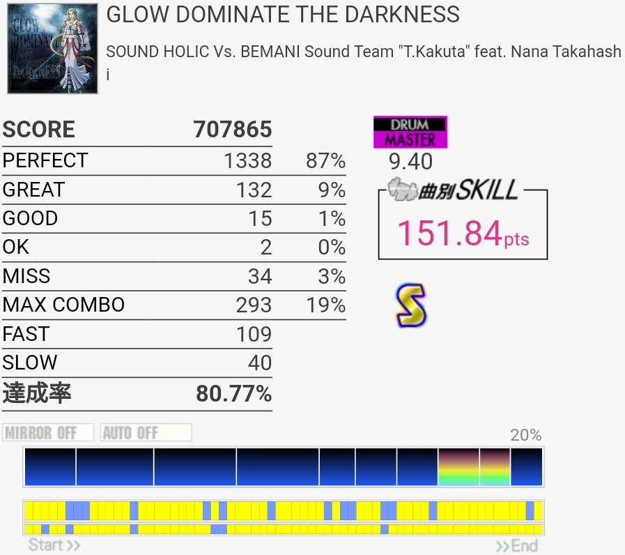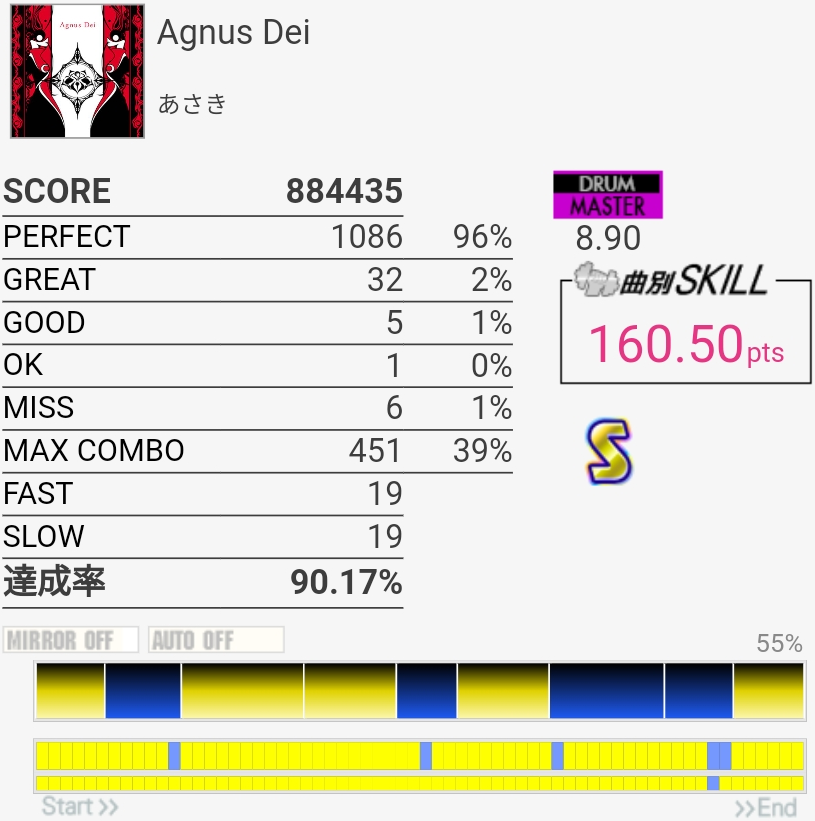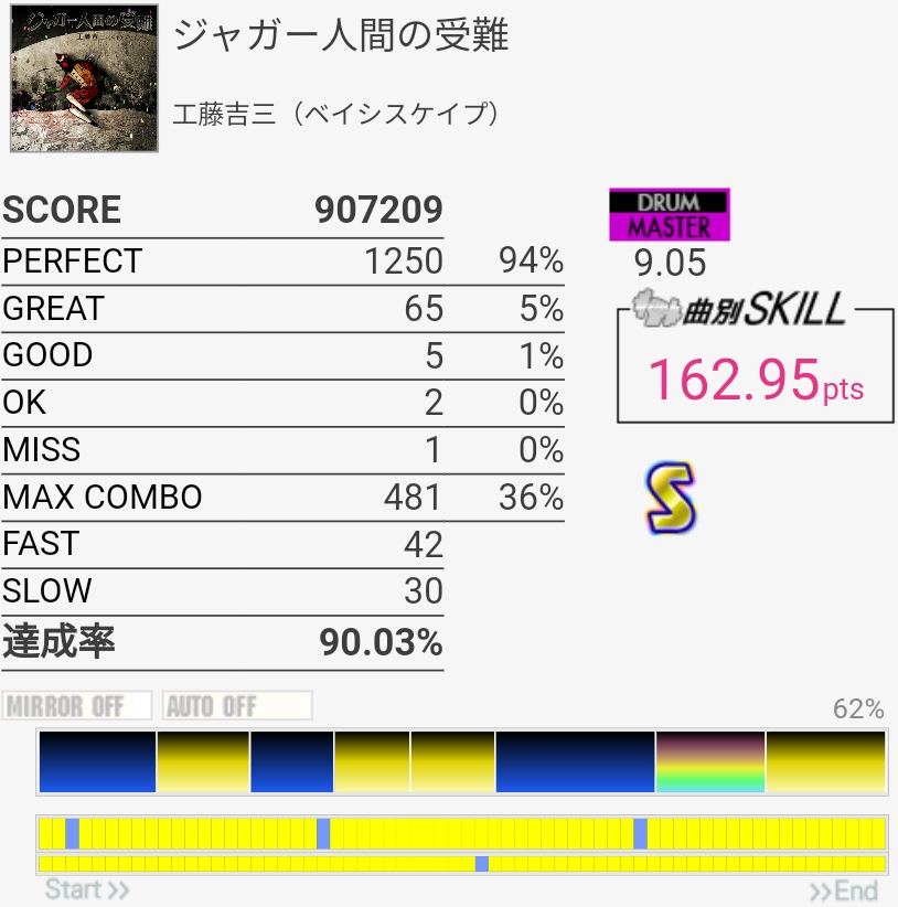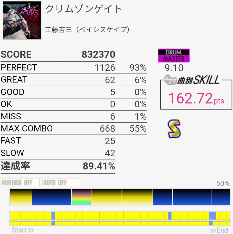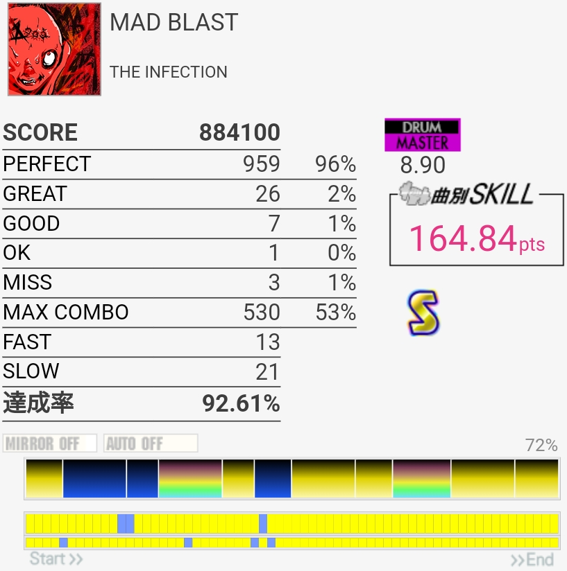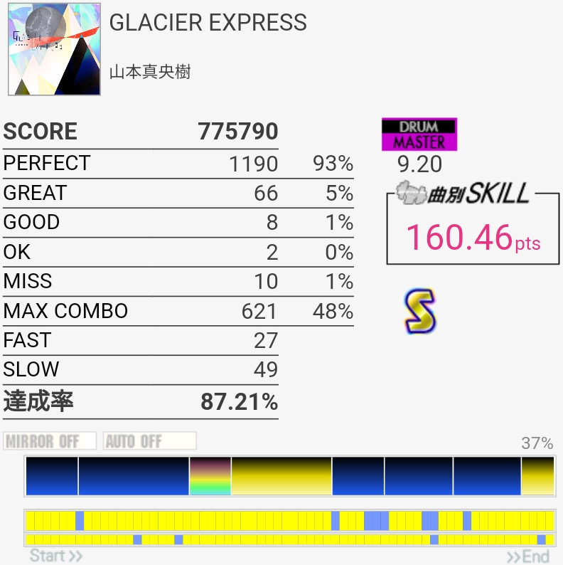 けっこううまかった。前半1か所リズム忘れててGOOD出ちゃったのと真ん中のHHでちょっとSLOW気味だったのが惜しい。