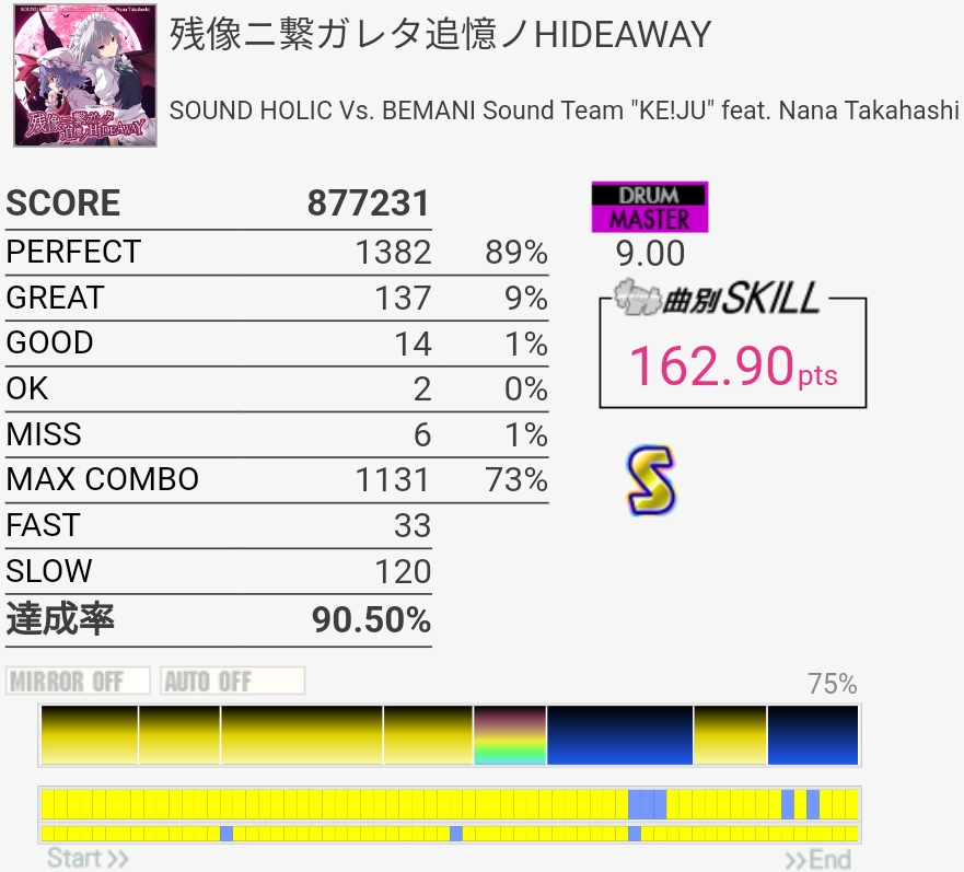 初見A判定だった。サビのHHとSNはパターンほぼ一定だからシングルでいいんだけど、その合間に挟まってるフィルに左入りするのがめちゃめちゃ難しい。長い3連CY地帯もあるしシンプルにしんどいという印象。ホームの筐体じゃ跳ねなさすぎて辛い。曲は爽やかでいいのに……。