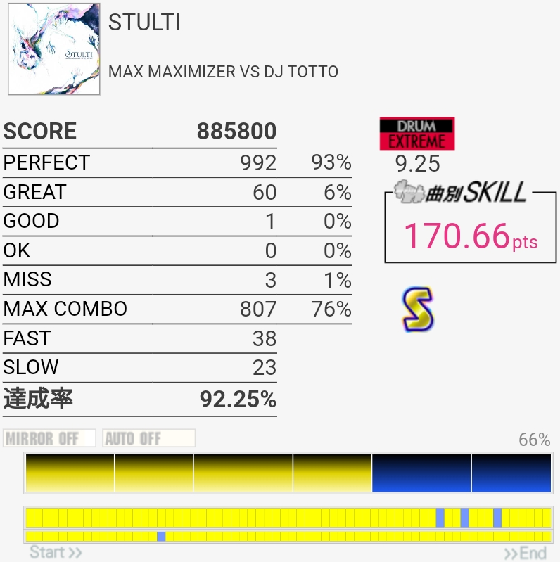 サビ終盤の2回目のHH→LCが上手くいかなくてそこから崩れた。SNのパッドが金具を叩いてるみたいな感触なのでどんどん判定がわからなくなる。
