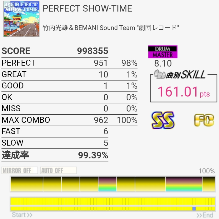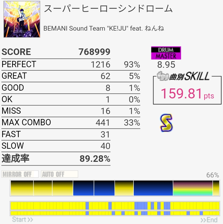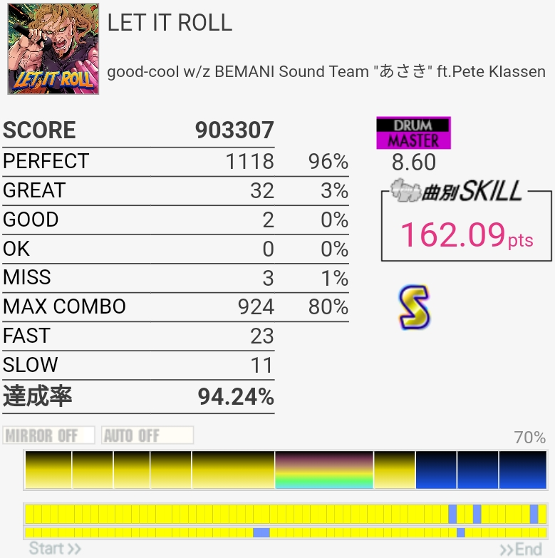 サビのフィルは左入りで全部叩けるのでなんとかなりそうだけど結局三連CYが叩けないのよね。できるようになればもうちょいスキル上がるのに……。