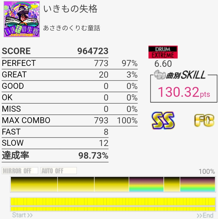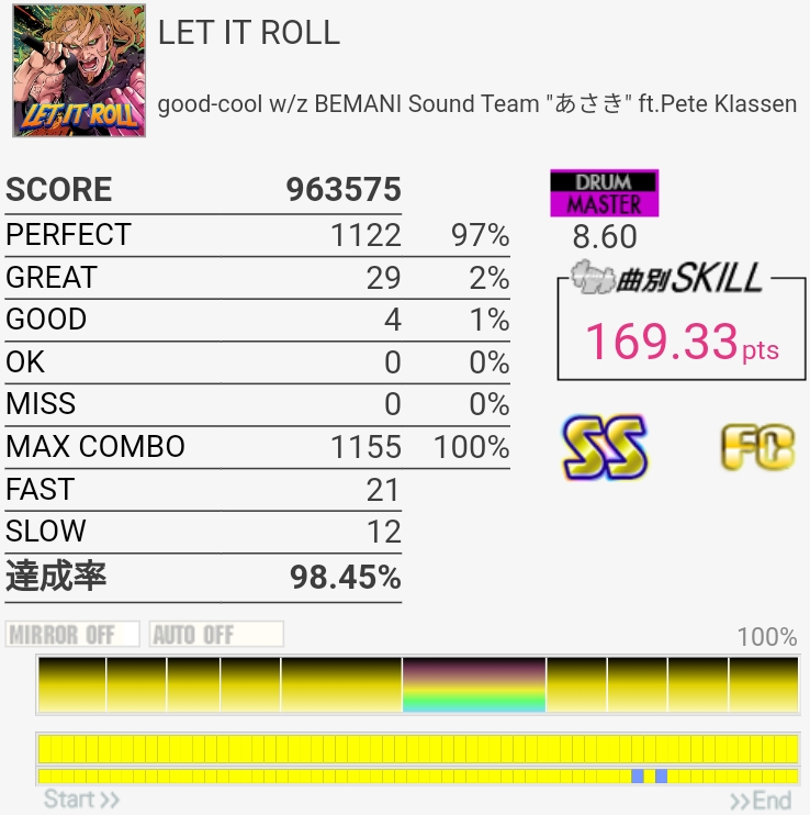 フルコン……だけどパフェ率が低すぎる。こんなのGOOD出してちゃダメだしせめて99%は取らないと。16分SNが全部GREATになったりするんだよな……。