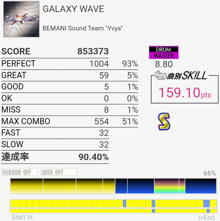 これでSS乗らないのか……今回は16分からの三連符SNをけっこうはっきりと叩けてたんだけどスティックが滑って一打だけ抜けちゃった。