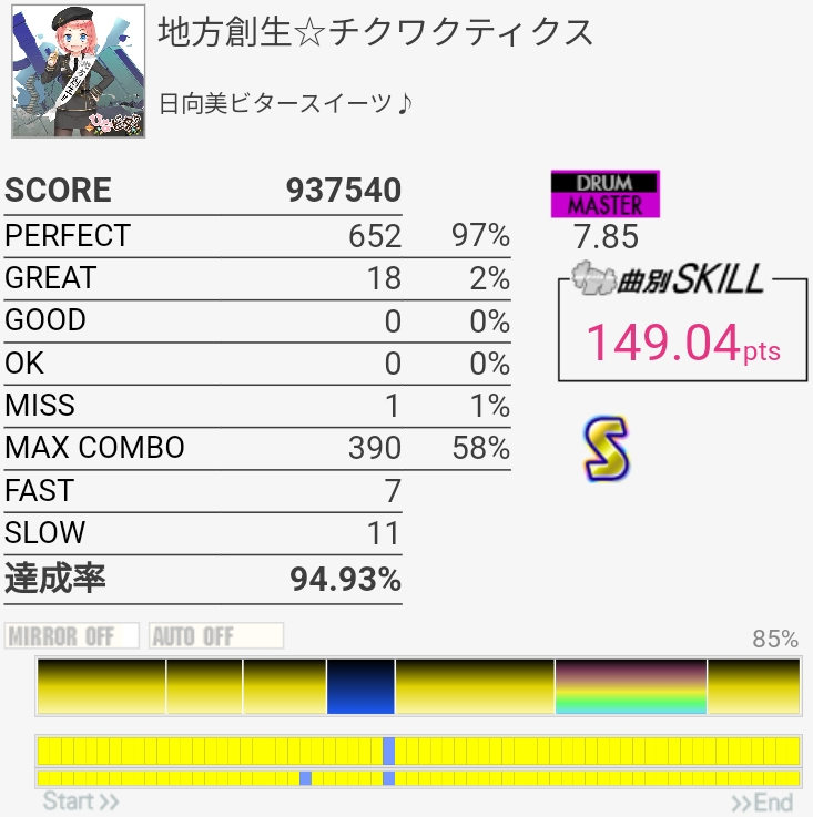 5フレーズ目のFT×3→ドコドッコドコドッコのところの勝率が悪い。たぶん早く踏んでるからFT4回叩いた方がいいかも。その後の16分SN→LT×2→FT×2は左手ダブルを叩くときに手の角度が外に向いちゃうのでLTの叩き方が変になってるっぽい。