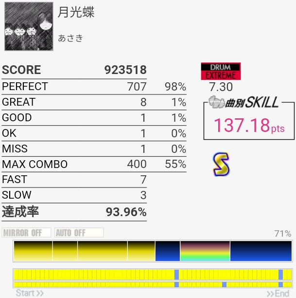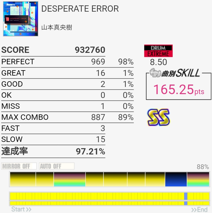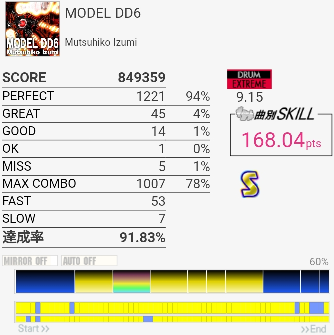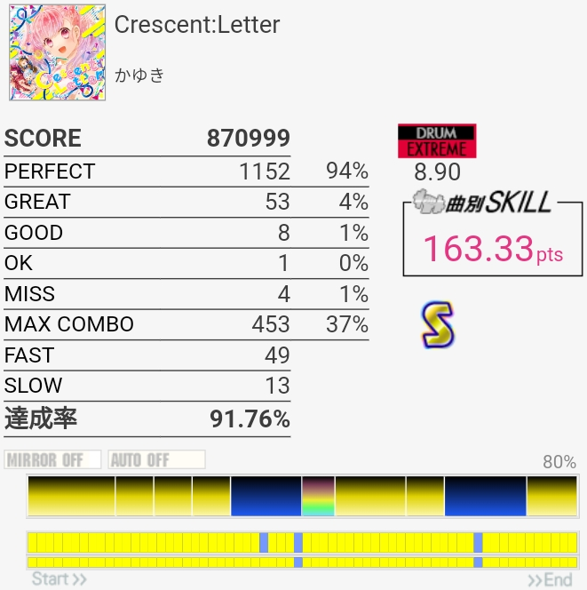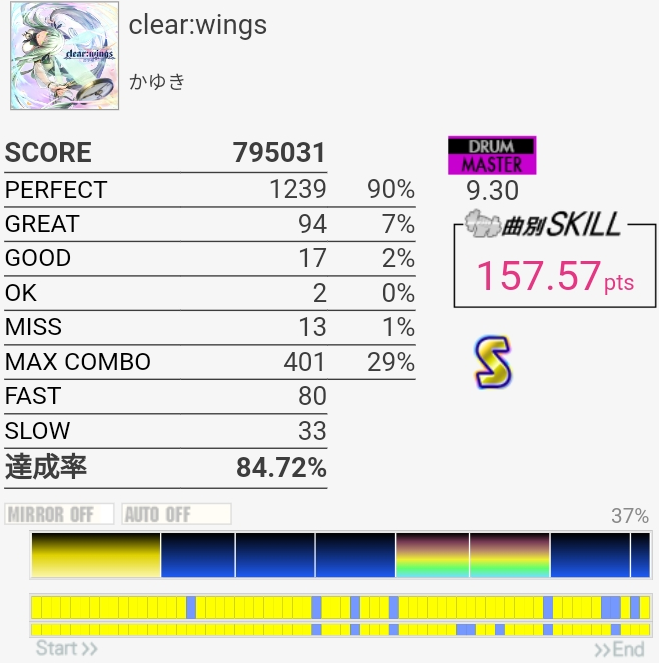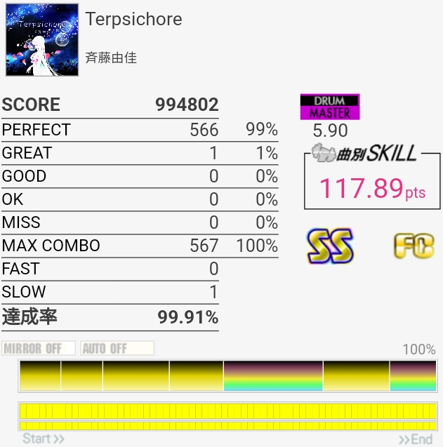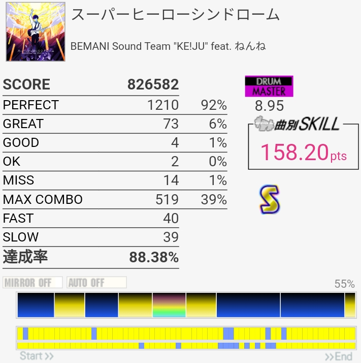 SNの表裏忘れてて序盤ミスったのもったいない。左入りのフィルはだんだん覚えてきたのでサビ前の3連CYだけでも繋がれば伸びるのだが。