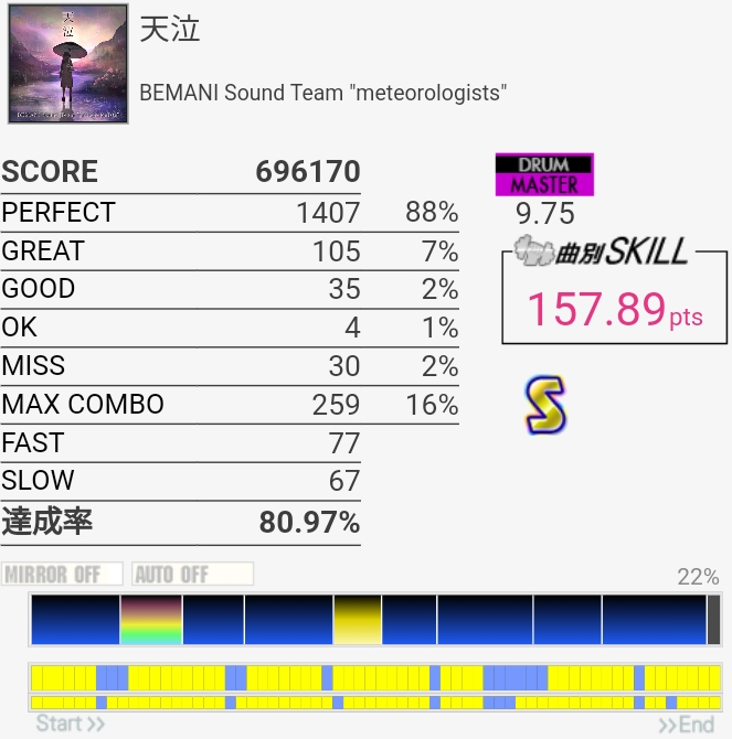 最初の16分HH絡みのところ全然わかってないけどなんか繋がった!いまいち判定の感覚が合ってなくて180点に届かなかったのが惜しいとはいえ切りそうなところで踏ん張れたからよかった。