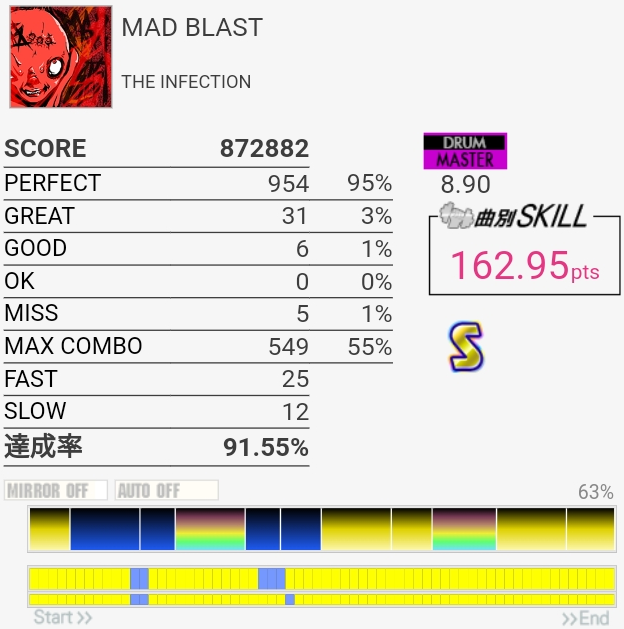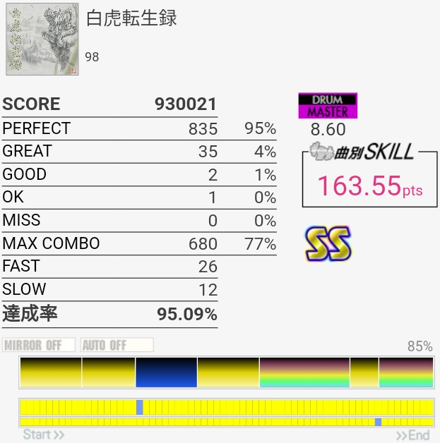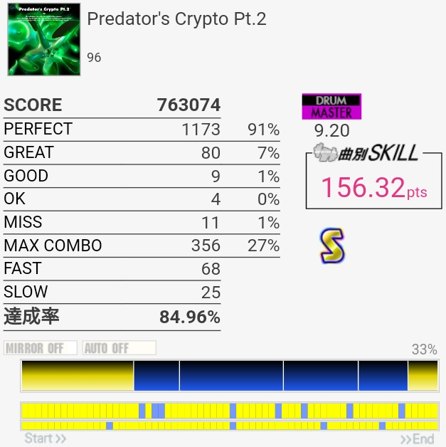 SS取得。SNちゃんと叩いたと思ったんだけど……タムから戻り切れなくて変なところ叩いたのかな。