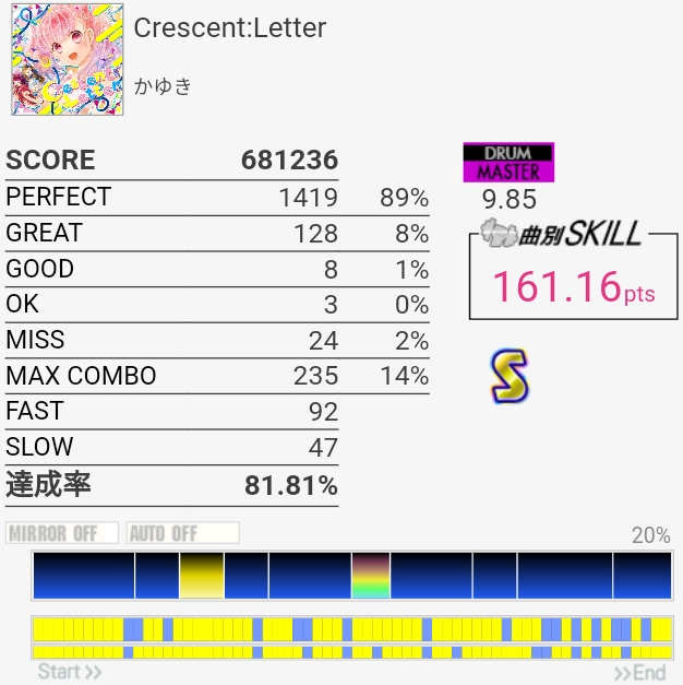 EXTを繋ごうとがんばってるうちにだいたいリズムと速い連打が来る部分を覚えてたので、もうMASをがんばった方がいいかも。調子いい時なら取れるフレーズけっこうあるはず……8分SN+4分CYのところはやっぱMASの方が簡単だよ。