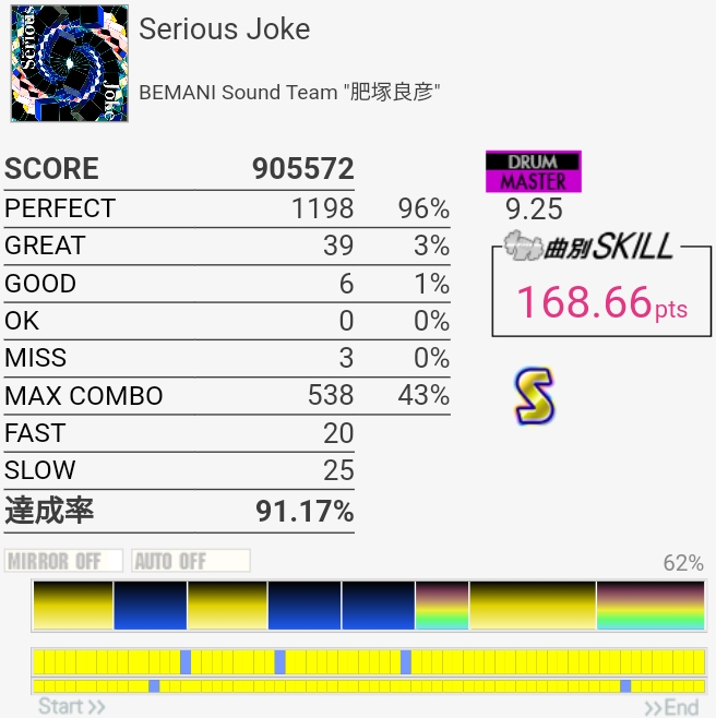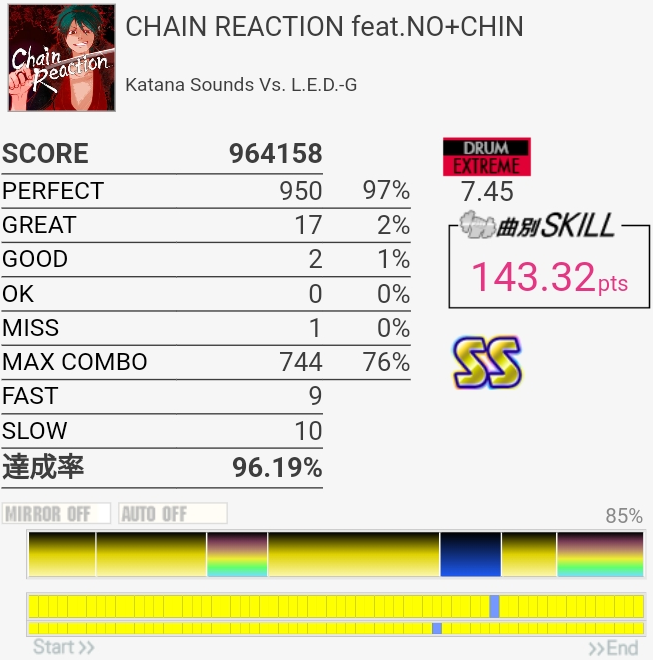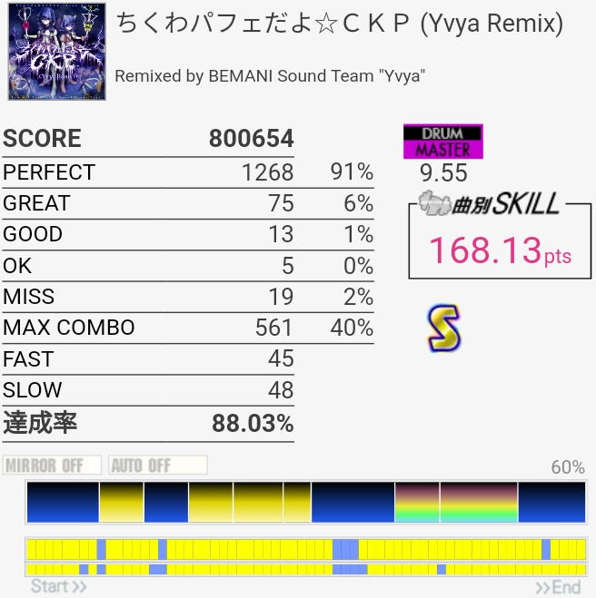 初見でなぜか繋がったけどもう一回やったらボロボロになりそう。曲もあんまり覚えてないけどカッコよかった気がするのでもうちょいパフェ率上げたいかな。