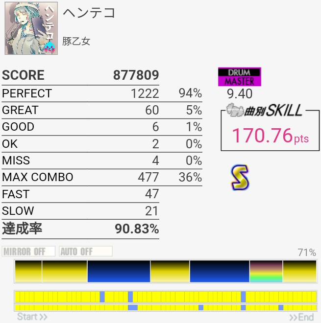 繰り返し譜面なんだけど7フレーズ目終わりのタム回しが移動キツくて叩けん。他の部分も粘着してるとだんだん叩き方がわからなくなってきて、前半のHT×2→LT×2→SN→FT8分……みたいなところは交互で叩けなくなってしまった。イントロもSN×3のせいで認識できなくて一回も叩けなかった。