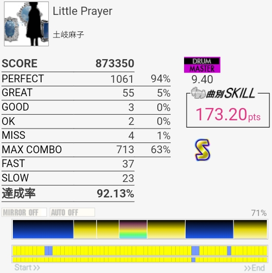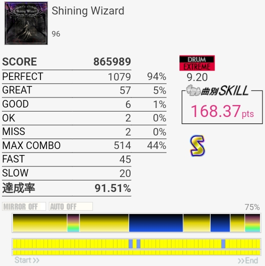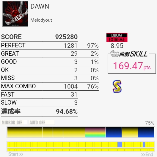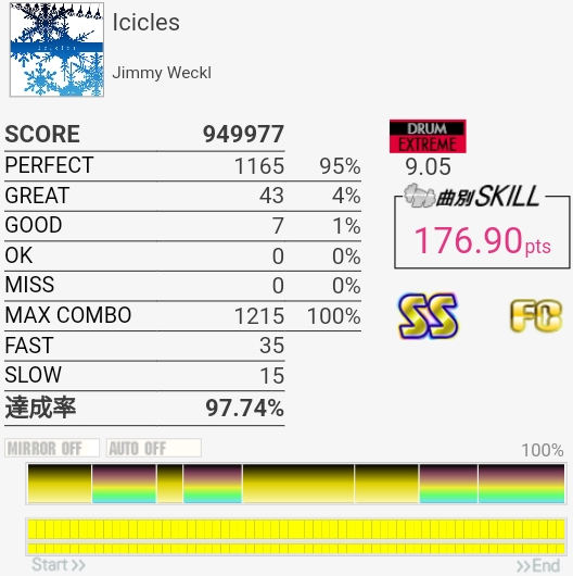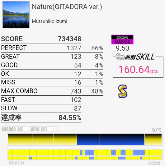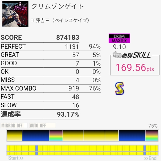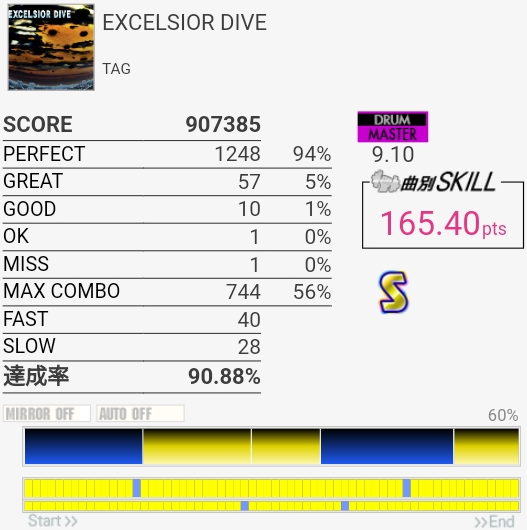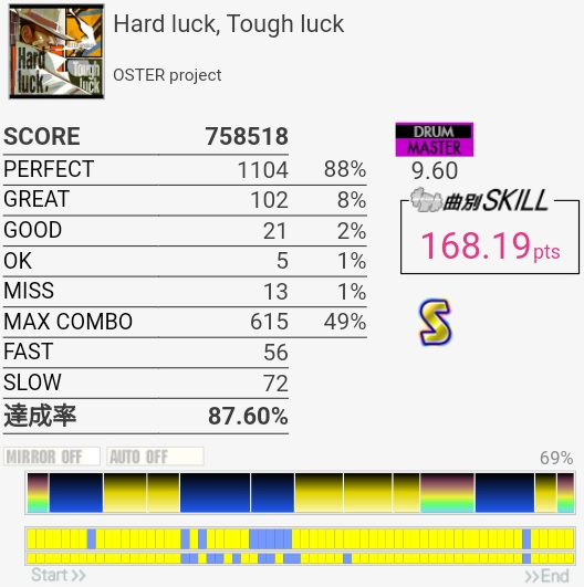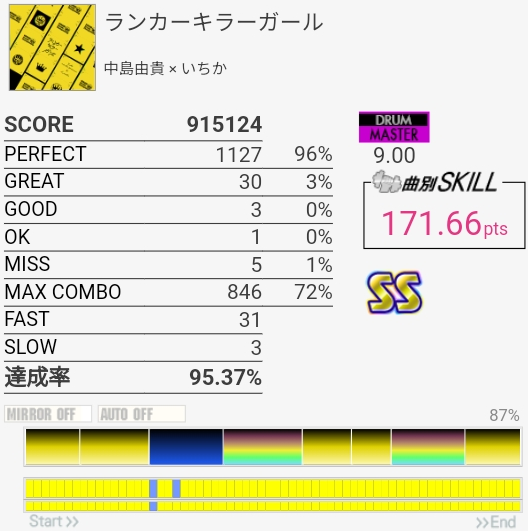 SS取り直して175点!やっぱラストのFTからの戻りがムズすぎ。道中のタム回しはしっかり引き付けて叩けたからめっちゃよかったと思う。この辺から調子が上がってきたかな。