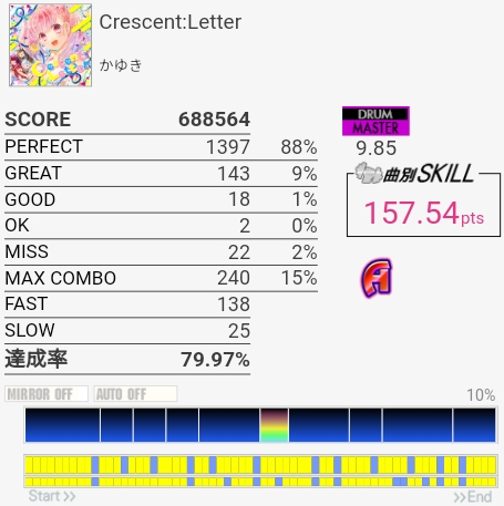 久しぶりにフルコンできた……集中力切れるとめっちゃズレるからやりたくないんだよな。175点取れてヨシ。