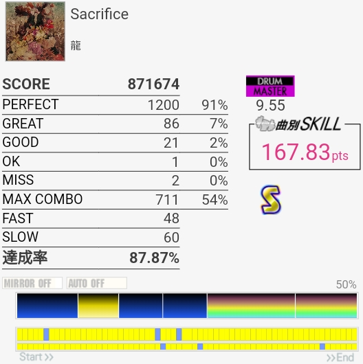 繋がりそうなMISS数してるんじゃないよ。3フレーズ目終わりのタム→SN+CYは意識したら全然叩けなくなってしまった。
