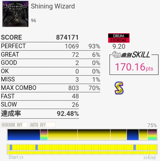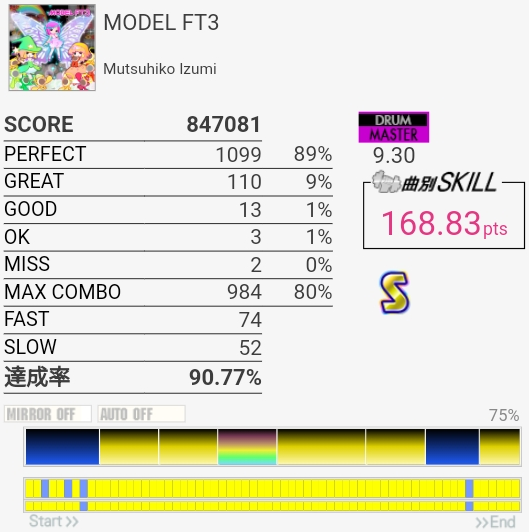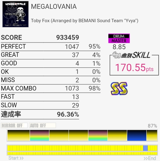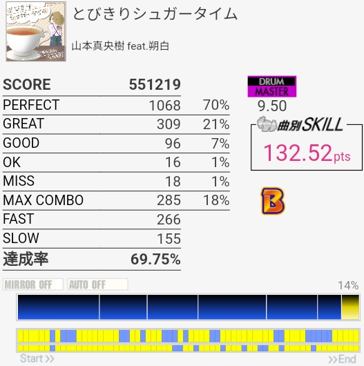 なんか最後でペダルが変な反応して終わった。8.85だと98.9%取らなきゃいけないのでどちらにしろダメだったんだけど……3連CYでめっちゃGREAT出た。