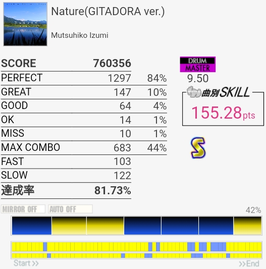 これも繋ぎ直したんだけど、前より達成率低いっていう。最初のデーンデーンデーンデーンデーデデデーだけでGREAT10個くらい出るし序盤の連BPも難しいしでパフェ率が上がらない。
